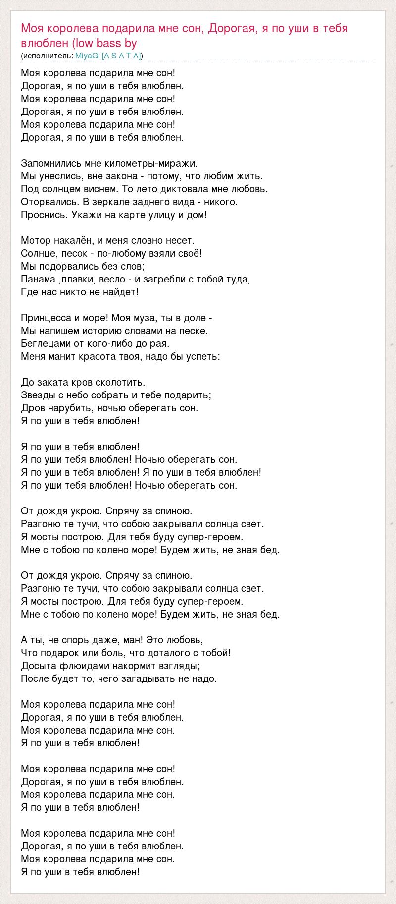 Моя королева подарила мне сон! Дорогая, я по уши в тебя влюблен. Моя королева подарила мне сон! Дорогая, я по уши в тебя влюблен. Моя королева подарила мне сон! Дорогая, я по уши в тебя влюблен. Запомнились мне километры-миражи. Мы унеслись, вне закона - потому, что любим жить. Под солнцем виснем. То лето диктовала мне любовь. Оторвались. В зеркале заднего вида - никого. Проснись. Укажи на карте улицу и дом! Мотор накалён, и меня словно несет. Солнце, песок - по-любому взяли своё! Мы подорвались без слов; Панама ,плавки, весло - и загребли с тобой туда, Где нас никто не найдет! Принцесса и море! Моя муза, ты в доле - Мы напишем историю словами на песке. Беглецами от кого-либо до рая. Меня манит красота твоя, надо бы успеть: До заката кров сколотить. Звезды с небо собрать и тебе подарить; Дров нарубить, ночью оберегать сон. Я по уши в тебя влюблен! Я по уши в тебя влюблен! Я по уши тебя влюблен! Ночью оберегать сон. Я по уши в тебя влюблен! Я по уши в тебя влюблен! Я по уши тебя влюблен! Ночью оберегать сон. От дождя укрою. Спрячу за спиною. Разгоню те тучи, что собою закрывали солнца свет. Я мосты построю. Для тебя буду супер-героем. Мне с тобою по колено море! Будем жить, не зная бед. От дождя укрою. Спрячу за спиною. Разгоню те тучи, что собою закрывали солнца свет. Я мосты построю. Для тебя буду супер-героем. Мне с тобою по колено море! Будем жить, не зная бед. А ты, не спорь даже, ман! Это любовь, Что подарок или боль, что доталого с тобой! Досыта флюидами накормит взгляды; После будет то, чего загадывать не надо. Моя королева подарила мне сон! Дорогая, я по уши в тебя влюблен. Моя королева подарила мне сон. Я по уши в тебя влюблен! Моя королева подарила мне сон! Дорогая, я по уши в тебя влюблен. Моя королева подарила мне сон. Я по уши в тебя влюблен! Моя королева подарила мне сон! Дорогая, я по уши в тебя влюблен. Моя королева подарила мне сон. Я по уши в тебя влюблен!