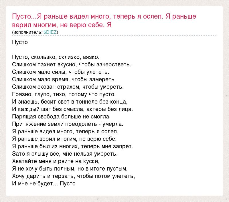 Главная→Исполнители→5DIEZ→Пусто...Я раньше видел много, теперь я ослеп. Я раньше верил многим, не верю се