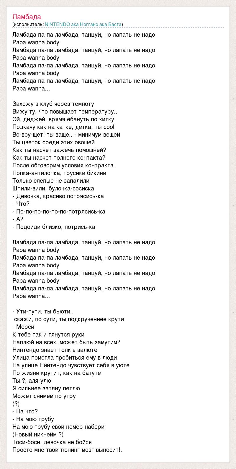 Ламбада па-па ламбада, танцуй, но лапать не надо Papa wanna body Ламбада па-па ламбада, танцуй, но лапать не надо Papa wanna body Ламбада па-па ламбада, танцуй, но лапать не надо Papa wanna body Ламбада па-па ламбада, танцуй, но лапать не надо Papa wanna... Захожу в клуб через темноту Вижу ту, что повышает температуру.. Эй, диджей, врямя ебануть по хитку Подкачу как на катке, детка, ты cool Во-воу-щет! ты ваще.. - минимум вещей Ты цветок среди этих овощей Как ты насчет зажечь помощней? Как ты насчет полного контакта? После обговорим условия контракта Попка-антилопка, трусики бикини Только слепые не запалили Шпили-вили, булочка-сосиска - Девочка, красиво потрясись-ка - Что? - По-по-по-по-по-по-потрясись-ка - А? - Подойди близко, потрись-ка Ламбада па-па ламбада, танцуй, но лапать не надо Papa wanna body Ламбада па-па ламбада, танцуй, но лапать не надо Papa wanna body Ламбада па-па ламбада, танцуй, но лапать не надо Papa wanna body Ламбада па-па ламбада, танцуй, но лапать не надо Papa wanna... - Ути-пути, ты бьюти.. скажи, по сути, ты подкрученнее крути - Мерси К тебе так и тянутся руки Наплюй на всех, может быть замутим? Нинтендо знает толк в валюте Улица помогла пробиться ему в люди На улице Нинтендо чувствует себя в уюте По жизни крутит, как на батуте Ты ?, аля-улю Я сильнее затяну петлю Может снимем по утру (?) - На что? - На мою трубу На мою трубу свой номер набери (Новый никнейм ?) Тоси-боси, девочка не бойся Просто мне твой тюнинг мозг выносит!.