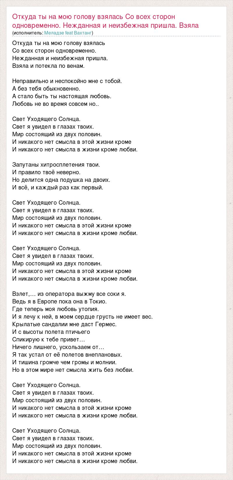 Откуда ты на мою голову взялась Со всех сторон одновременно. Нежданная и неизбежная пришла. Взяла и потекла по венам. Неправильно и неспокойно мне с тобой. А без тебя обыкновенно. А стало быть ты настоящая любовь. Любовь не во время совсем но.. Свет Уходящего Солнца. Свет я увидел в глазах твоих. Мир состоящий из двух половин. И никакого нет смысла в этой жизни кроме И никакого нет смысла в жизни кроме любви. Запутаны хитросплетения твои. И правило твоё неверно. Но делится одна подушка на двоих. И всё, и каждый раз как первый. Свет Уходящего Солнца. Свет я увидел в глазах твоих. Мир состоящий из двух половин. И никакого нет смысла в этой жизни кроме И никакого нет смысла в жизни кроме любви. Свет Уходящего Солнца. Свет я увидел в глазах твоих. Мир состоящий из двух половин. И никакого нет смысла в этой жизни кроме И никакого нет смысла в жизни кроме любви. Взлет,… из оператора выжму все соки я. Ведь я в Европе пока она в Токио. Где теперь моя любовь утопия. И я лечу к ней, в моем сердце грусть не имеет вес. Крылатые сандалии мне даст Гермес. И с высоты полета птичьего Спикирую к тебе привет… Ничего лишнего, ускользаем от… Я так устал от её полетов внеплановых. И тишина громче чем громы и молнии. Но в этом мире нет смысла жить без любви. Свет Уходящего Солнца. Свет я увидел в глазах твоих. Мир состоящий из двух половин. И никакого нет смысла в этой жизни кроме И никакого нет смысла в жизни кроме любви. Свет Уходящего Солнца. Свет я увидел в глазах твоих. Мир состоящий из двух половин. И никакого нет смысла в этой жизни кроме И никакого нет смысла в жизни кроме любви.