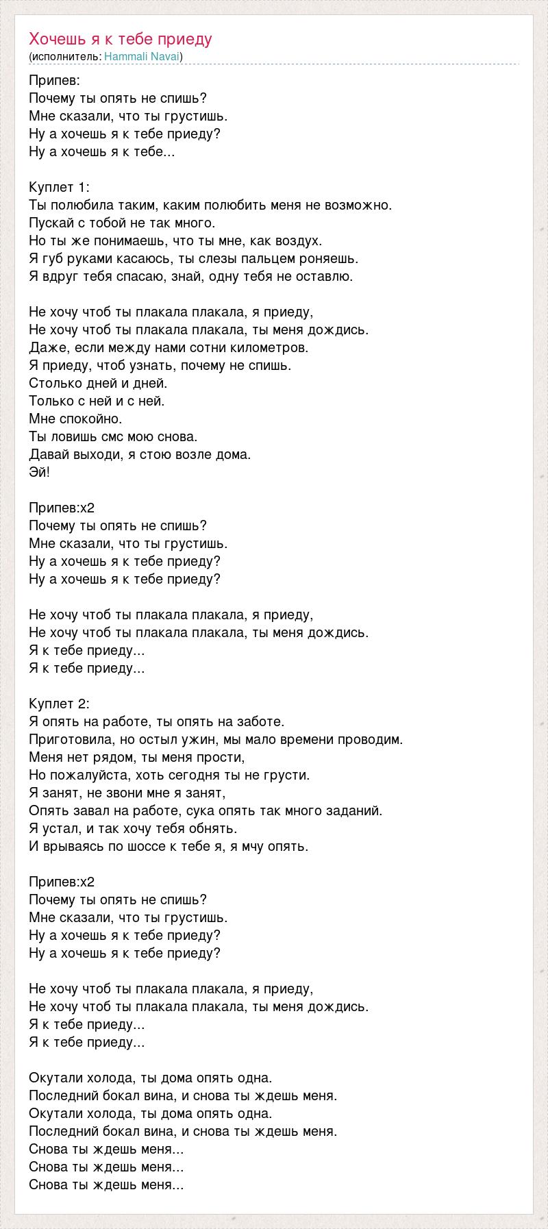 Припев: Почему ты опять не спишь? Мне сказали, что ты грустишь. Ну а хочешь я к тебе приеду? Ну а хочешь я к тебе... Куплет 1: Ты полюбила таким, каким полюбить меня не возможно. Пускай с тобой не так много. Но ты же понимаешь, что ты мне, как воздух. Я губ руками касаюсь, ты слезы пальцем роняешь. Я вдруг тебя спасаю, знай, одну тебя не оставлю. Не хочу чтоб ты плакала плакала, я приеду, Не хочу чтоб ты плакала плакала, ты меня дождись. Даже, если между нами сотни километров. Я приеду, чтоб узнать, почему не спишь. Столько дней и дней. Только с ней и с ней. Мне спокойно. Ты ловишь смс мою снова. Давай выходи, я стою возле дома. Эй! Припев:х2 Почему ты опять не спишь? Мне сказали, что ты грустишь. Ну а хочешь я к тебе приеду? Ну а хочешь я к тебе приеду? Не хочу чтоб ты плакала плакала, я приеду, Не хочу чтоб ты плакала плакала, ты меня дождись. Я к тебе приеду... Я к тебе приеду... Куплет 2: Я опять на работе, ты опять на заботе. Приготовила, но остыл ужин, мы мало времени проводим. Меня нет рядом, ты меня прости, Но пожалуйста, хоть сегодня ты не грусти. Я занят, не звони мне я занят, Опять завал на работе, сука опять так много заданий. Я устал, и так хочу тебя обнять. И врываясь по шоссе к тебе я, я мчу опять. Припев:х2 Почему ты опять не спишь? Мне сказали, что ты грустишь. Ну а хочешь я к тебе приеду? Ну а хочешь я к тебе приеду? Не хочу чтоб ты плакала плакала, я приеду, Не хочу чтоб ты плакала плакала, ты меня дождись. Я к тебе приеду... Я к тебе приеду... Окутали холода, ты дома опять одна. Последний бокал вина, и снова ты ждешь меня. Окутали холода, ты дома опять одна. Последний бокал вина, и снова ты ждешь меня. Снова ты ждешь меня... Снова ты ждешь меня... Снова ты ждешь меня...