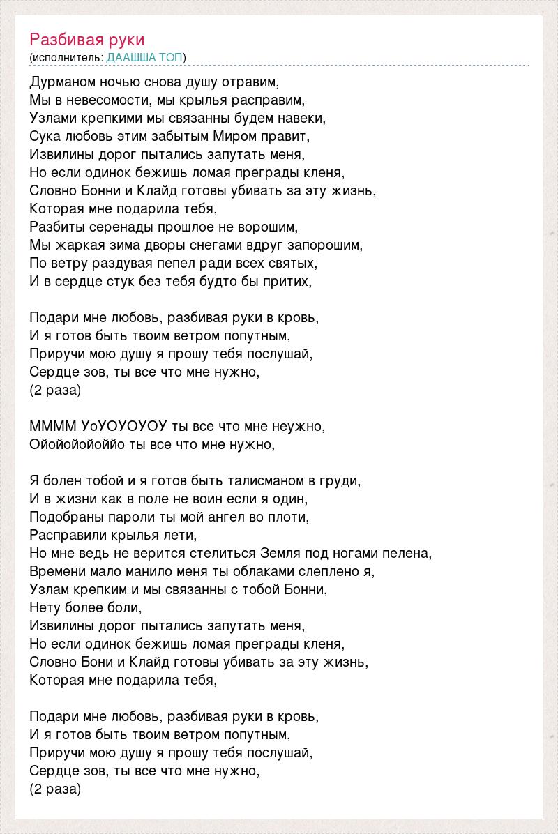 Дурманом ночью снова душу отравим, Мы в невесомости, мы крылья расправим, Узлами крепкими мы связанны будем навеки, Сука любовь этим забытым Миром правит, Извилины дорог пытались запутать меня, Но если одинок бежишь ломая преграды кленя, Словно Бонни и Клайд готовы убивать за эту жизнь, Которая мне подарила тебя, Разбиты серенады прошлое не ворошим, Мы жаркая зима дворы снегами вдруг запорошим, По ветру раздувая пепел ради всех святых, И в сердце стук без тебя будто бы притих, Подари мне любовь, разбивая руки в кровь, И я готов быть твоим ветром попутным, Приручи мою душу я прошу тебя послушай, Сердце зов, ты все что мне нужно, (2 раза) ММММ УоУОУОУОУ ты все что мне неужно, Ойойойойоййо ты все что мне нужно, Я болен тобой и я готов быть талисманом в груди, И в жизни как в поле не воин если я один, Подобраны пароли ты мой ангел во плоти, Расправили крылья лети, Но мне ведь не верится стелиться Земля под ногами пелена, Времени мало манило меня ты облаками слеплено я, Узлам крепким и мы связанны с тобой Бонни, Нету более боли, Извилины дорог пытались запутать меня, Но если одинок бежишь ломая преграды кленя, Словно Бони и Клайд готовы убивать за эту жизнь, Которая мне подарила тебя, Подари мне любовь, разбивая руки в кровь, И я готов быть твоим ветром попутным, Приручи мою душу я прошу тебя послушай, Сердце зов, ты все что мне нужно, (2 раза)