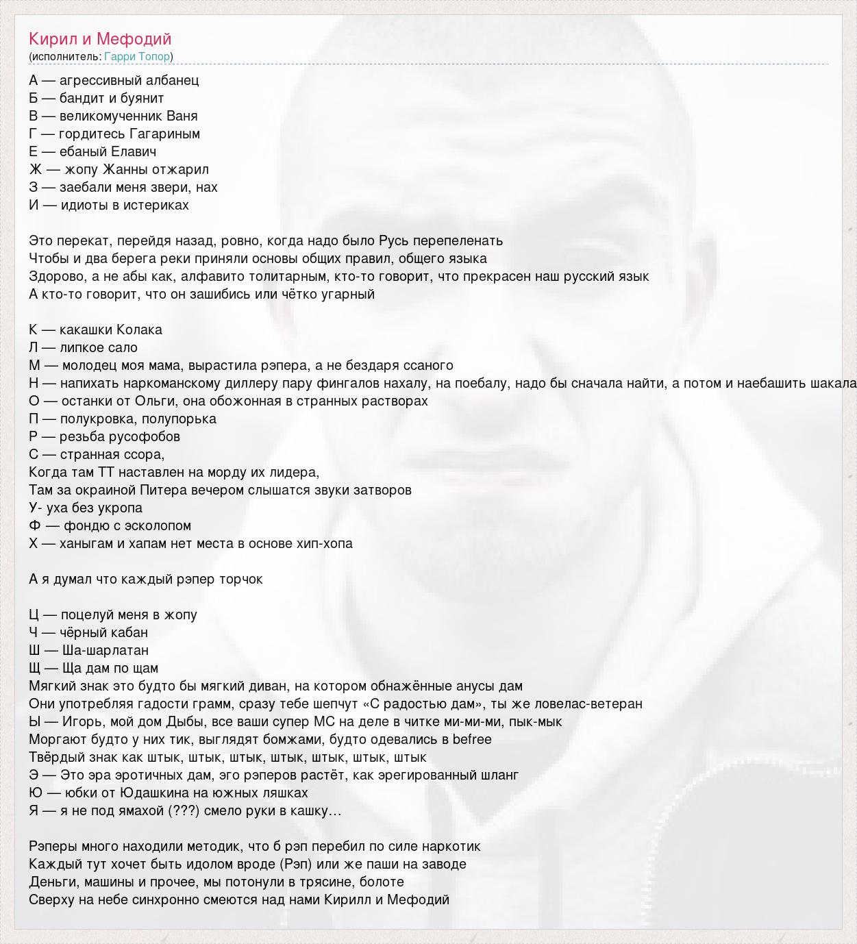 А — агрессивный албанец Б — бандит и буянит В — великомученник Ваня Г — гордитесь Гагариным Е — ебаный Елавич Ж — жопу Жанны отжарил З — заебали меня звери, нах И — идиоты в истериках Это перекат, перейдя назад, ровно, когда надо было Русь перепеленать Чтобы и два берега реки приняли основы общих правил, общего языка Здорово, а не абы как, алфавито толитарным, кто-то говорит, что прекрасен наш русский язык А кто-то говорит, что он зашибись или чётко угарный К — какашки Колака Л — липкое сало М — молодец моя мама, вырастила рэпера, а не бездаря ссаного Н — напихать наркоманскому диллеру пару фингалов нахалу, на поебалу, надо бы сначала найти, а потом и наебашить шакала О — останки от Ольги, она обожонная в странных растворах П — полукровка, полупорька Р — резьба русофобов С — странная ссора, Когда там ТТ наставлен на морду их лидера, Там за окраиной Питера вечером слышатся звуки затворов У- уха без укропа Ф — фондю с эсколопом Х — ханыгам и хапам нет места в основе хип-хопа А я думал что каждый рэпер торчок Ц — поцелуй меня в жопу Ч — чёрный кабан Ш — Ша-шарлатан Щ — Ща дам по щам Мягкий знак это будто бы мягкий диван, на котором обнажённые анусы дам Они употребляя гадости грамм, сразу тебе шепчут «С радостью дам», ты же ловелас-ветеран Ы — Игорь, мой дом Дыбы, все ваши супер МС на деле в читке ми-ми-ми, пык-мык Моргают будто у них тик, выглядят бомжами, будто одевались в befree Твёрдый знак как штык, штык, штык, штык, штык, штык, штык Э — Это эра эротичных дам, эго рэперов растёт, как эрегированный шланг Ю — юбки от Юдашкина на южных ляшках Я — я не под ямахой (???) смело руки в кашку… Рэперы много находили методик, что б рэп перебил по силе наркотик Каждый тут хочет быть идолом вроде (Рэп) или же паши на заводе Деньги, машины и прочее, мы потонули в трясине, болоте Сверху на небе синхронно смеются над нами Кирилл и Мефодий