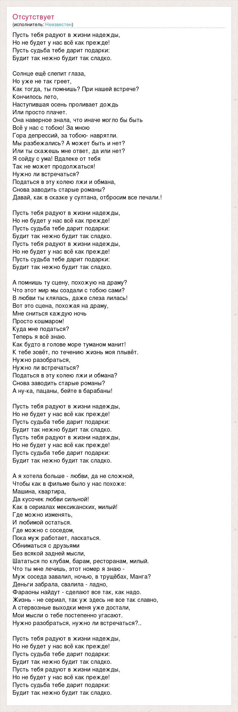 Пусть тебя радуют в жизни надежды, Но не будет у нас всё как прежде! Пусть судьба тебе дарит подарки: Будит так нежно будит так сладко. Солнце ещё слепит глаза, Но уже не так греет, Как тогда, ты помнишь? При нашей встрече? Кончилось лето, Наступившая осень проливает дождь Или просто плачет. Она наверное знала, что иначе могло бы быть Всё у нас с тобою! За мною Гора депрессий, за тобою- наврятли. Мы разбежались? А может быть и нет? Или ты скажешь мне ответ, да или нет? Я сойду с ума! Вдалеке от тебя Так не может продолжаться! Нужно ли встречаться? Податься в эту колею лжи и обмана, Снова заводить старые романы? Давай, как в сказке у султана, отбросим все печали.! Пусть тебя радуют в жизни надежды, Но не будет у нас всё как прежде! Пусть судьба тебе дарит подарки: Будит так нежно будит так сладко. Пусть тебя радуют в жизни надежды, Но не будет у нас всё как прежде! Пусть судьба тебе дарит подарки: Будит так нежно будит так сладко. А помнишь ту сцену, похожую на драму? Что этот мир мы создали с тобою сами? В любви ты клялась, даже слеза лилась! Вот это сцена, похожая на драму, Мне сниться каждую ночь Просто кошмаром! Куда мне податься? Теперь я всё знаю. Как будто в голове море туманом манит! К тебе зовёт, по течению жизнь моя плывёт. Нужно разобраться, Нужно ли встречаться? Податься в эту колею лжи и обмана? Снова заводить старые романы? А ну-ка, пацаны, бейте в барабаны! Пусть тебя радуют в жизни надежды, Но не будет у нас всё как прежде! Пусть судьба тебе дарит подарки: Будит так нежно будит так сладко. Пусть тебя радуют в жизни надежды, Но не будет у нас всё как прежде! Пусть судьба тебе дарит подарки: Будит так нежно будит так сладко. А я хотела больше - любви, да не сложной, Чтобы как в фильме было у нас похоже: Машина, квартира, Да кусочек любви сильной! Как в сериалах мексиканских, милый! Где можно изменять, И любимой остаться. Где можно с соседом, Пока муж работает, ласкаться. Обниматься с друзьями Без всякой задней мысли, Шататься по клубам, барам, ресторанам, милый. Что ты мне лечишь, этот номер я знаю - Муж соседа завалил, ночью, в трущёбах, Манга? Деньги забрала, свалила - ладно, Фараоны найдут - сделают все так, как надо. Жизнь - не сериал, так уж здесь не все так славно, А стервозные выходки меня уже достали, Мои мысли о тебе постепенно угасают. Нужно разобраться, нужно ли встречаться?.. Пусть тебя радуют в жизни надежды, Но не будет у нас всё как прежде! Пусть судьба тебе дарит подарки: Будит так нежно будит так сладко. Пусть тебя радуют в жизни надежды, Но не будет у нас всё как прежде! Пусть судьба тебе дарит подарки: Будит так нежно будит так сладко.