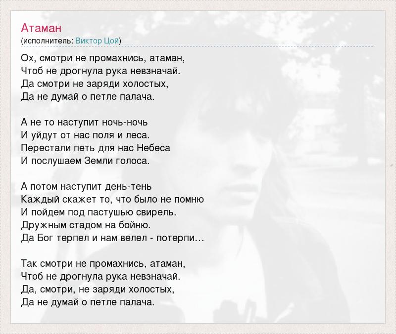 Ох, смотри не промахнись, атаман, Чтоб не дрогнула рука невзначай. Да смотри не заряди холостых, Да не думай о петле палача. А не то наступит ночь-ночь И уйдут от нас поля и леса. Перестали петь для нас Небеса И послушаем Земли голоса. А потом наступит день-тень Каждый скажет то, что было не помню И пойдем под пастушью свирель. Дружным стадом на бойню. Да Бог терпел и нам велел - потерпи… Так смотри не промахнись, атаман, Чтоб не дрогнула рука невзначай. Да, смотри, не заряди холостых, Да не думай о петле палача.