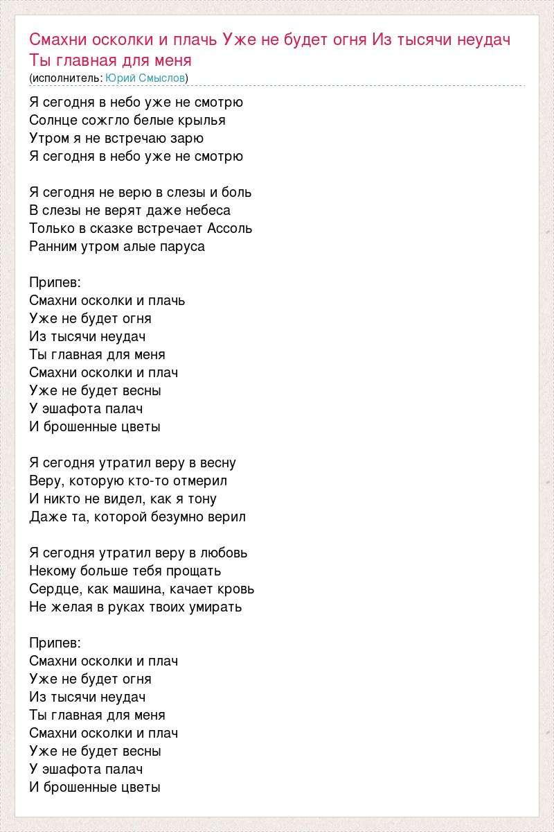 Я сегодня в небо уже не смотрю Солнце сожгло белые крылья Утром я не встречаю зарю Я сегодня в небо уже не смотрю Я сегодня не верю в слезы и боль В слезы не верят даже небеса Только в сказке встречает Ассоль Ранним утром алые паруса Припев: Смахни осколки и плачь Уже не будет огня Из тысячи неудач Ты главная для меня Смахни осколки и плач Уже не будет весны У эшафота палач И брошенные цветы Я сегодня утратил веру в весну Веру, которую кто-то отмерил И никто не видел, как я тону Даже та, которой безумно верил Я сегодня утратил веру в любовь Некому больше тебя прощать Сердце, как машина, качает кровь Не желая в руках твоих умирать Припев: Смахни осколки и плач Уже не будет огня Из тысячи неудач Ты главная для меня Смахни осколки и плач Уже не будет весны У эшафота палач И брошенные цветы