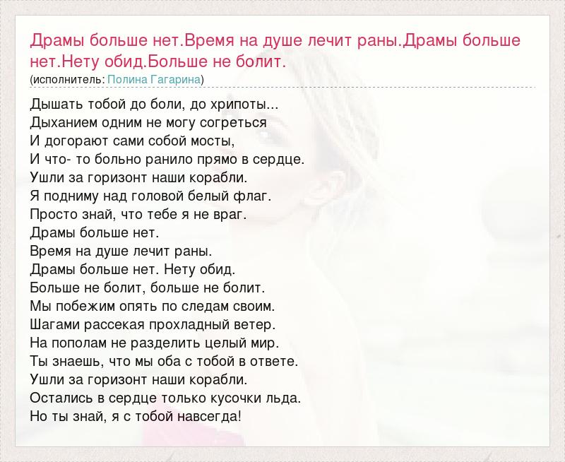 Дышать тобой до боли, до хрипоты... Дыханием одним не могу согреться И догорают сами собой мосты, И что- то больно ранило прямо в сердце. Ушли за горизонт наши корабли. Я подниму над головой белый флаг. Просто знай, что тебе я не враг. Драмы больше нет. Время на душе лечит раны. Драмы больше нет. Нету обид. Больше не болит, больше не болит. Мы побежим опять по следам своим. Шагами рассекая прохладный ветер. На пополам не разделить целый мир. Ты знаешь, что мы оба с тобой в ответе. Ушли за горизонт наши корабли. Остались в сердце только кусочки льда. Но ты знай, я с тобой навсегда!
