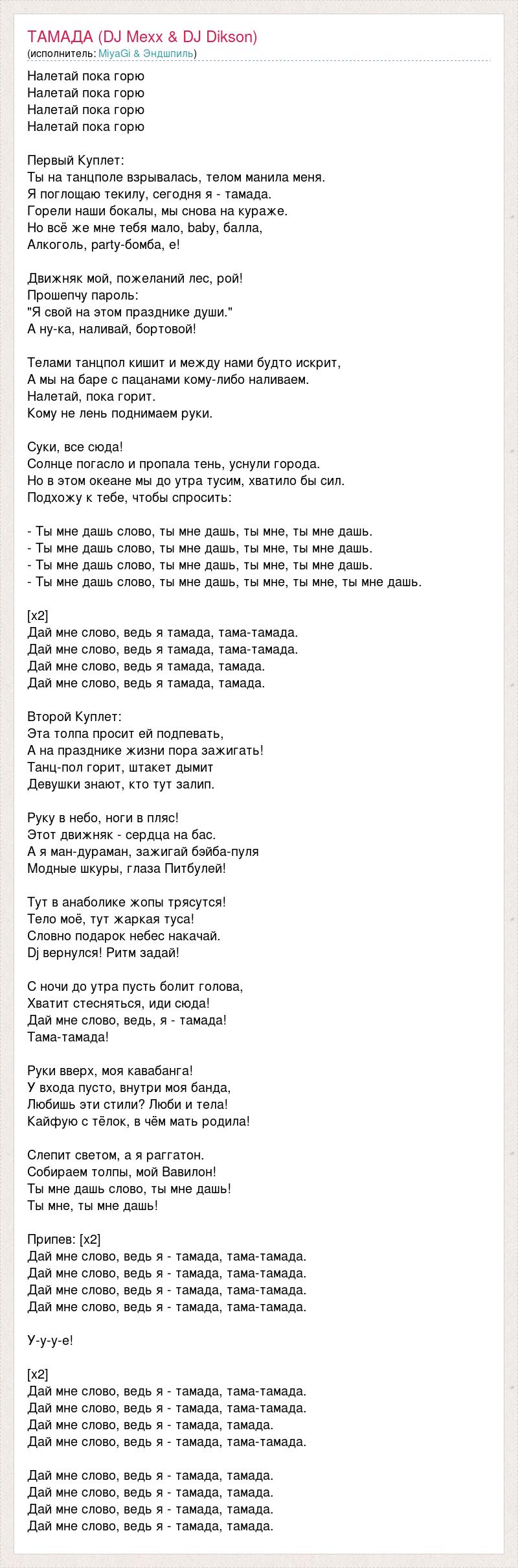 Налетай пока горю Налетай пока горю Налетай пока горю Налетай пока горю Первый Куплет: Ты на танцполе взрывалась, телом манила меня. Я поглощаю текилу, сегодня я - тамада. Горели наши бокалы, мы снова на кураже. Но всё же мне тебя мало, baby, балла, Алкоголь, party-бомба, е! Движняк мой, пожеланий лес, рой! Прошепчу пароль: "Я свой на этом празднике души." А ну-ка, наливай, бортовой! Телами танцпол кишит и между нами будто искрит, А мы на баре с пацанами кому-либо наливаем. Налетай, пока горит. Кому не лень поднимаем руки. Суки, все сюда! Солнце погасло и пропала тень, уснули города. Но в этом океане мы до утра тусим, хватило бы сил. Подхожу к тебе, чтобы спросить: - Ты мне дашь слово, ты мне дашь, ты мне, ты мне дашь. - Ты мне дашь слово, ты мне дашь, ты мне, ты мне дашь. - Ты мне дашь слово, ты мне дашь, ты мне, ты мне дашь. - Ты мне дашь слово, ты мне дашь, ты мне, ты мне, ты мне дашь. [х2] Дай мне слово, ведь я тамада, тама-тамада. Дай мне слово, ведь я тамада, тама-тамада. Дай мне слово, ведь я тамада, тамада. Дай мне слово, ведь я тамада, тамада. Второй Куплет: Эта толпа просит ей подпевать, А на празднике жизни пора зажигать! Танц-пол горит, штакет дымит Девушки знают, кто тут залип. Руку в небо, ноги в пляс! Этот движняк - сердца на бас. А я ман-дураман, зажигай бэйба-пуля Модные шкуры, глаза Питбулей! Тут в анаболике жопы трясутся! Тело моё, тут жаркая туса! Словно подарок небес накачай. Dj вернулся! Ритм задай! С ночи до утра пусть болит голова, Хватит стесняться, иди сюда! Дай мне слово, ведь, я - тамада! Тама-тамада! Руки вверх, моя кавабанга! У входа пусто, внутри моя банда, Любишь эти стили? Люби и тела! Кайфую с тёлок, в чём мать родила! Слепит светом, а я раггатон. Собираем толпы, мой Вавилон! Ты мне дашь слово, ты мне дашь! Ты мне, ты мне дашь! Припев: [х2] Дай мне слово, ведь я - тамада, тама-тамада. Дай мне слово, ведь я - тамада, тама-тамада. Дай мне слово, ведь я - тамада, тама-тамада. Дай мне слово, ведь я - тамада, тама-тамада. У-у-у-е! [х2] Дай мне слово, ведь я - тамада, тама-тамада. Дай мне слово, ведь я - тамада, тама-тамада. Дай мне слово, ведь я - тамада, тамада. Дай мне слово, ведь я - тамада, тама-тамада. Дай мне слово, ведь я - тамада, тамада. Дай мне слово, ведь я - тамада, тамада. Дай мне слово, ведь я - тамада, тамада. Дай мне слово, ведь я - тамада, тамада.
