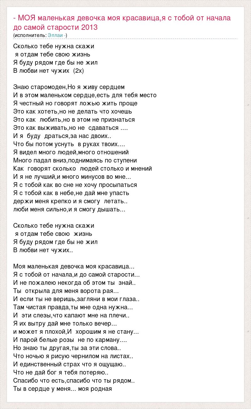 Сколько тебе нужна скажи я отдам тебе свою жизнь Я буду рядом где бы не жил В любви нет чужих (2х) Знаю старомоден,Но я живу сердцем И в этом маленьком сердце,есть для тебя место Я честный но говорят ложью жить проще Это как хотеть,но не делать что хочешь Это как любить,но в этом не признаться Это как выживать,но не сдаваться .... И я буду драться,за нас двоих.. Что бы потом уснуть в руках твоих.... Я видел много людей,много отношений Много падал вниз,поднимаясь по ступени Как говорят сколько людей столько и мнений И я не лучший,и много минусов во мне... Я с тобой как во сне не хочу просыпаться Я с тобой как в небе,не дай мне упасть держи меня крепко и я смогу летать.. люби меня сильно,и я смогу дышать... Сколько тебе нужна скажи я отдам тебе свою жизнь Я буду рядом где бы не жил В любви нет чужих.. Моя маленькая девочка моя красавица... Я с тобой от начала,и до самой старости... И не пожалею некогда об этом ты знай.. Ты открыла для меня ворота рая... И если ты не веришь,загляни в мои глаза.. Там чистая правда,ты мне одна нужна... И эти слезы,что капают мне на плечи.. Я их вытру дай мне только вечер... и может я плохой,И хорошим я не стану... И парой белые розы не по карману.... Но знаю ты другая,ты за эти слова.. Что ночью я рисую чернилом на листах.. И единственный страх что я ощущаю.. Что не дай бог я тебя потеряю.. Спасибо что есть,спасибо что ты рядом.. Ты в сердце у меня... моя родная
