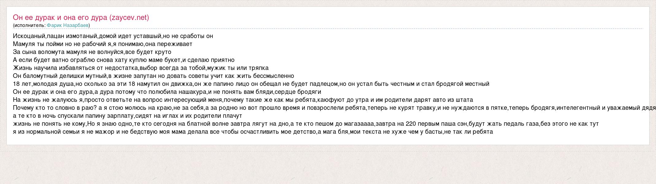 Искоцаный,пацан измотаный,домой идет уставшый,но не сработы он Мамуля ты пойми но не рабочий я,я понимаю,она переживает За сына воломута мамуля не волнуйся,все будет круто А если будет ватно ограблю снова хату куплю маме букет,и сделаю приятно Жизнь научила избавляться от недостатка,выбор всегда за тобой,мужик ты или тряпка Он баломутный делишки мутный,в жизне запутан но довать советы учит как жить бессмысленно 18 лет,молодая душа,но сколько за эти 18 намутил он движка,он же папино лицо он обещал не будет падлецом,но он устал быть честным и стал бродягой местный Он ее дурак и она его дура,а дура потому что полюбила нашакура,и не понять вам бляди,сердце бродяги На жизнь не жалуюсь я,просто ответьте на вопрос интересующий меня,почему такие же как мы ребята,каюфуют до утра и им родители дарят авто из штата Почему кто то словно в раю? а я стою молюсь на краю,не за себя,а за родню но вот прошло время и повзрослели ребята,теперь не курят травку,и не нуждаются в пятке,теперь бродягя,интелегентный и уважаемый дядя а те кто в ночь спускали папину зарплату,сидят на иглах и их родители плачут жизнь не понять не кому,Но я знаю одно,те кто сегодня на блатной волне завтра лягут на дно,а те кто пешом до магазаааа,завтра на 220 первым паша сэн,будут жать педаль газа,без этого не как тут я из нормальной семьи я не мажор и не бедствую моя мама делала все чтобы осчастливить мое детство,а мага бля,мои текста не хуже чем у басты,не так ли ребята