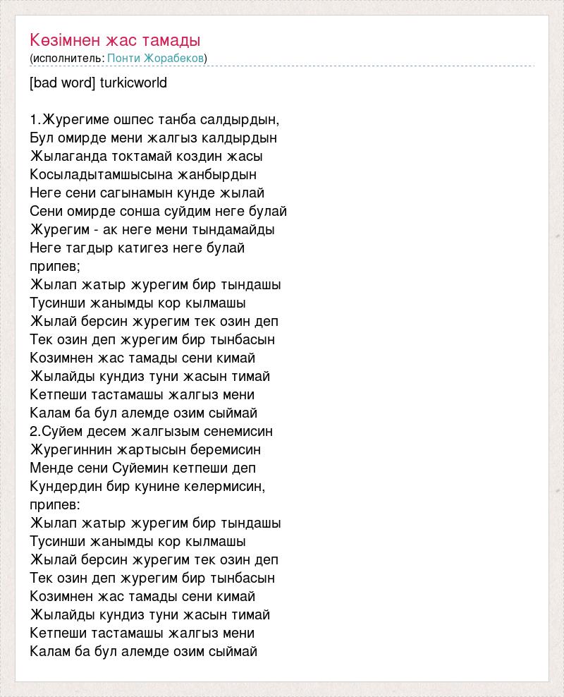[bad word] turkicworld 1.Журегиме ошпес танба салдырдын, Бул омирде мени жалгыз калдырдын Жылаганда токтамай коздин жасы Косыладытамшысына жанбырдын Неге сени сагынамын кунде жылай Сени омирде сонша суйдим неге булай Журегим - ак неге мени тындамайды Неге тагдыр катигез неге булай припев; Жылап жатыр журегим бир тындашы Тусинши жанымды кор кылмашы Жылай берсин журегим тек озин деп Тек озин деп журегим бир тынбасын Козимнен жас тамады сени кимай Жылайды кундиз туни жасын тимай Кетпеши тастамашы жалгыз мени Калам ба бул алемде озим сыймай 2.Суйем десем жалгызым сенемисин Журегиннин жартысын беремисин Менде сени Суйемин кетпеши деп Кундердин бир кунине келермисин, припев: Жылап жатыр журегим бир тындашы Тусинши жанымды кор кылмашы Жылай берсин журегим тек озин деп Тек озин деп журегим бир тынбасын Козимнен жас тамады сени кимай Жылайды кундиз туни жасын тимай Кетпеши тастамашы жалгыз мени Калам ба бул алемде озим сыймай