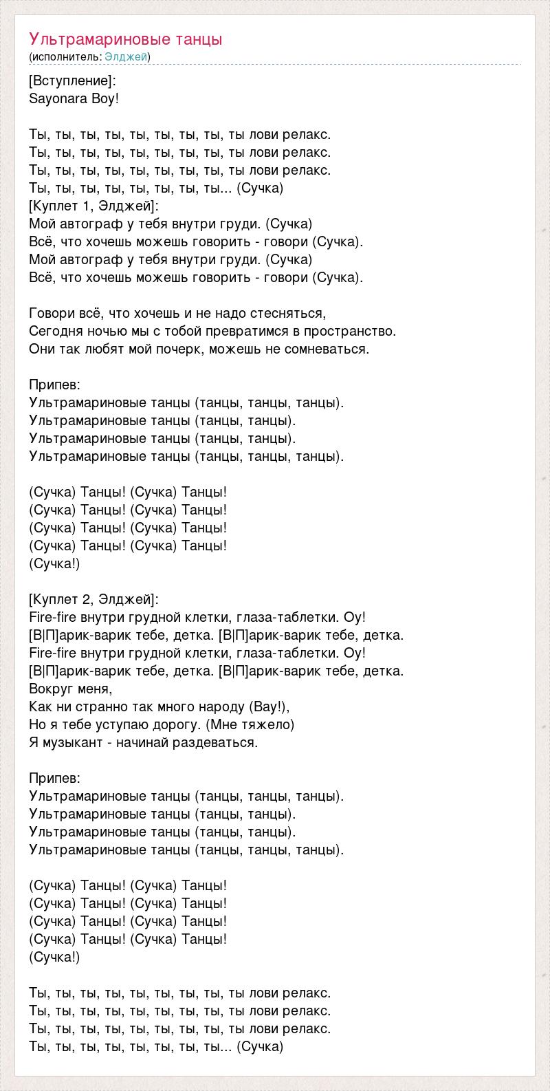 [Вступление]: Sayonara Boy! Ты, ты, ты, ты, ты, ты, ты, ты, ты лови релакс. Ты, ты, ты, ты, ты, ты, ты, ты, ты лови релакс. Ты, ты, ты, ты, ты, ты, ты, ты, ты лови релакс. Ты, ты, ты, ты, ты, ты, ты, ты... (Сучка) [Куплет 1, Элджей]: Мой автограф у тебя внутри груди. (Сучка) Всё, что хочешь можешь говорить - говори (Сучка). Мой автограф у тебя внутри груди. (Сучка) Всё, что хочешь можешь говорить - говори (Сучка). Говори всё, что хочешь и не надо стесняться, Сегодня ночью мы с тобой превратимся в пространство. Они так любят мой почерк, можешь не сомневаться. Припев: Ультрамариновые танцы (танцы, танцы, танцы). Ультрамариновые танцы (танцы, танцы). Ультрамариновые танцы (танцы, танцы). Ультрамариновые танцы (танцы, танцы, танцы). (Сучка) Танцы! (Сучка) Танцы! (Сучка) Танцы! (Сучка) Танцы! (Сучка) Танцы! (Сучка) Танцы! (Сучка) Танцы! (Сучка) Танцы! (Сучка!) [Куплет 2, Элджей]: Fire-fire внутри грудной клетки, глаза-таблетки. Оу! [В|П]арик-варик тебе, детка. [В|П]арик-варик тебе, детка. Fire-fire внутри грудной клетки, глаза-таблетки. Оу! [В|П]арик-варик тебе, детка. [В|П]арик-варик тебе, детка. Вокруг меня, Как ни странно так много народу (Вау!), Но я тебе уступаю дорогу. (Мне тяжело) Я музыкант - начинай раздеваться. Припев: Ультрамариновые танцы (танцы, танцы, танцы). Ультрамариновые танцы (танцы, танцы). Ультрамариновые танцы (танцы, танцы). Ультрамариновые танцы (танцы, танцы, танцы). (Сучка) Танцы! (Сучка) Танцы! (Сучка) Танцы! (Сучка) Танцы! (Сучка) Танцы! (Сучка) Танцы! (Сучка) Танцы! (Сучка) Танцы! (Сучка!) Ты, ты, ты, ты, ты, ты, ты, ты, ты лови релакс. Ты, ты, ты, ты, ты, ты, ты, ты, ты лови релакс. Ты, ты, ты, ты, ты, ты, ты, ты, ты лови релакс. Ты, ты, ты, ты, ты, ты, ты, ты... (Сучка)