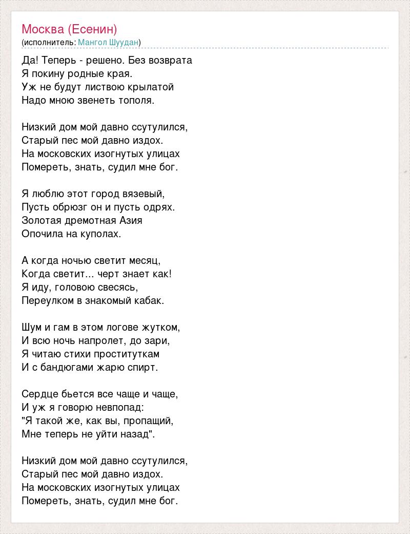 Да! Теперь - решено. Без возврата Я покину родные края. Уж не будут листвою крылатой Надо мною звенеть тополя. Низкий дом мой давно ссутулился, Старый пес мой давно издох. На московских изогнутых улицах Помереть, знать, судил мне бог. Я люблю этот город вязевый, Пусть обрюзг он и пусть одрях. Золотая дремотная Азия Опочила на куполах. А когда ночью светит месяц, Когда светит... черт знает как! Я иду, головою свесясь, Переулком в знакомый кабак. Шум и гам в этом логове жутком, И всю ночь напролет, до зари, Я читаю стихи проституткам И с бандюгами жарю спирт. Сердце бьется все чаще и чаще, И уж я говорю невпопад: "Я такой же, как вы, пропащий, Мне теперь не уйти назад". Низкий дом мой давно ссутулился, Старый пес мой давно издох. На московских изогнутых улицах Помереть, знать, судил мне бог.