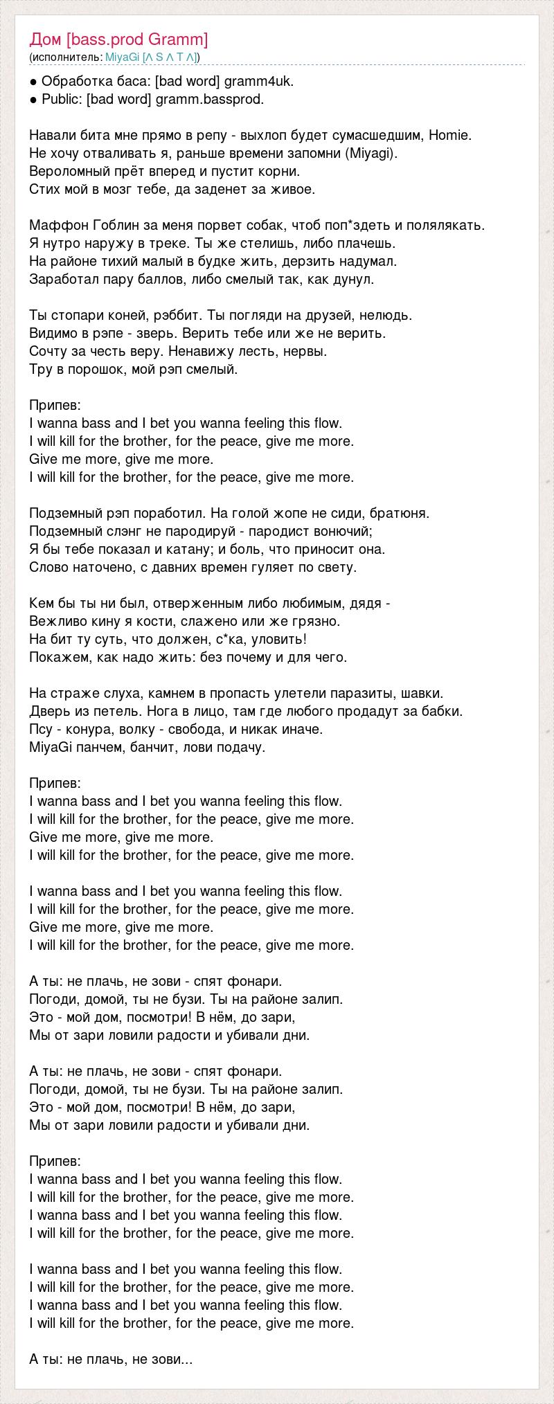● Обработка баса: [bad word] gramm4uk. ● Public: [bad word] gramm.bassprod. Навали бита мне прямо в репу - выхлоп будет сумасшедшим, Homie. Не хочу отваливать я, раньше времени запомни (Miyagi). Вероломный прёт вперед и пустит корни. Стих мой в мозг тебе, да заденет за живое. Маффон Гоблин за меня порвет собак, чтоб поп*здеть и полялякать. Я нутро наружу в треке. Ты же стелишь, либо плачешь. На районе тихий малый в будке жить, дерзить надумал. Заработал пару баллов, либо смелый так, как дунул. Ты стопари коней, рэббит. Ты погляди на друзей, нелюдь. Видимо в рэпе - зверь. Верить тебе или же не верить. Сочту за честь веру. Ненавижу лесть, нервы. Тру в порошок, мой рэп смелый. Припев: I wanna bass and I bet you wanna feeling this flow. I will kill for the brother, for the peace, give me more. Give me more, give me more. I will kill for the brother, for the peace, give me more. Подземный рэп поработил. На голой жопе не сиди, братюня. Подземный слэнг не пародируй - пародист вонючий; Я бы тебе показал и катану; и боль, что приносит она. Слово наточено, с давних времен гуляет по свету. Кем бы ты ни был, отверженным либо любимым, дядя - Вежливо кину я кости, слажено или же грязно. На бит ту суть, что должен, с*ка, уловить! Покажем, как надо жить: без почему и для чего. На страже слуха, камнем в пропасть улетели паразиты, шавки. Дверь из петель. Нога в лицо, там где любого продадут за бабки. Псу - конура, волку - свобода, и никак иначе. MiyaGi панчем, банчит, лови подачу. Припев: I wanna bass and I bet you wanna feeling this flow. I will kill for the brother, for the peace, give me more. Give me more, give me more. I will kill for the brother, for the peace, give me more. I wanna bass and I bet you wanna feeling this flow. I will kill for the brother, for the peace, give me more. Give me more, give me more. I will kill for the brother, for the peace, give me more. А ты: не плачь, не зови - спят фонари. Погоди, домой, ты не бузи. Ты на районе залип. Это - мой дом, посмотри! В нём, до зари, Мы от зари ловили радости и убивали дни. А ты: не плачь, не зови - спят фонари. Погоди, домой, ты не бузи. Ты на районе залип. Это - мой дом, посмотри! В нём, до зари, Мы от зари ловили радости и убивали дни. Припев: I wanna bass and I bet you wanna feeling this flow. I will kill for the brother, for the peace, give me more. I wanna bass and I bet you wanna feeling this flow. I will kill for the brother, for the peace, give me more. I wanna bass and I bet you wanna feeling this flow. I will kill for the brother, for the peace, give me more. I wanna bass and I bet you wanna feeling this flow. I will kill for the brother, for the peace, give me more. А ты: не плачь, не зови...