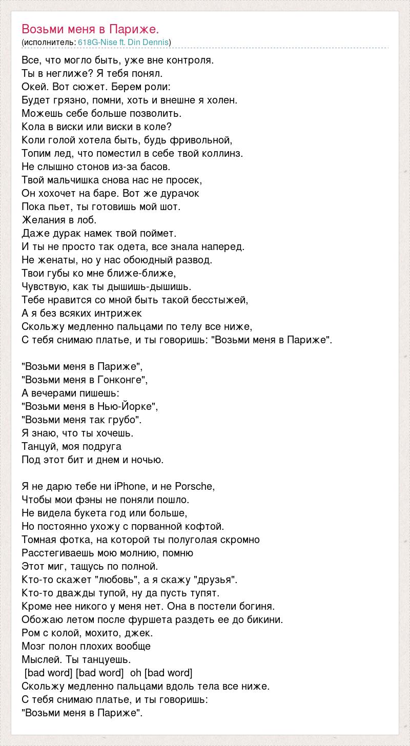 Все, что могло быть, уже вне контроля. Ты в неглиже? Я тебя понял. Окей. Вот сюжет. Берем роли: Будет грязно, помни, хоть и внешне я холен. Можешь себе больше позволить. Кола в виски или виски в коле? Коли голой хотела быть, будь фривольной, Топим лед, что поместил в себе твой коллинз. Не слышно стонов из-за басов. Твой мальчишка снова нас не просек, Он хохочет на баре. Вот же дурачок Пока пьет, ты готовишь мой шот. Желания в лоб. Даже дурак намек твой поймет. И ты не просто так одета, все знала наперед. Не женаты, но у нас обоюдный развод. Твои губы ко мне ближе-ближе, Чувствую, как ты дышишь-дышишь. Тебе нравится со мной быть такой бесстыжей, А я без всяких интрижек Скольжу медленно пальцами по телу все ниже, С тебя снимаю платье, и ты говоришь: "Возьми меня в Париже". "Возьми меня в Париже", "Возьми меня в Гонконге", А вечерами пишешь: "Возьми меня в Нью-Йорке", "Возьми меня так грубо". Я знаю, что ты хочешь. Танцуй, моя подруга Под этот бит и днем и ночью. Я не дарю тебе ни iPhone, и не Porsche, Чтобы мои фэны не поняли пошло. Не видела букета год или больше, Но постоянно ухожу с порванной кофтой. Томная фотка, на которой ты полуголая скромно Расстегиваешь мою молнию, помню Этот миг, тащусь по полной. Кто-то скажет "любовь", а я скажу "друзья". Кто-то дважды тупой, ну да пусть тупят. Кроме нее никого у меня нет. Она в постели богиня. Обожаю летом после фуршета раздеть ее до бикини. Ром с колой, мохито, джек. Мозг полон плохих вообще Мыслей. Ты танцуешь. [bad word] [bad word] oh [bad word] Скольжу медленно пальцами вдоль тела все ниже. С тебя снимаю платье, и ты говоришь: "Возьми меня в Париже".