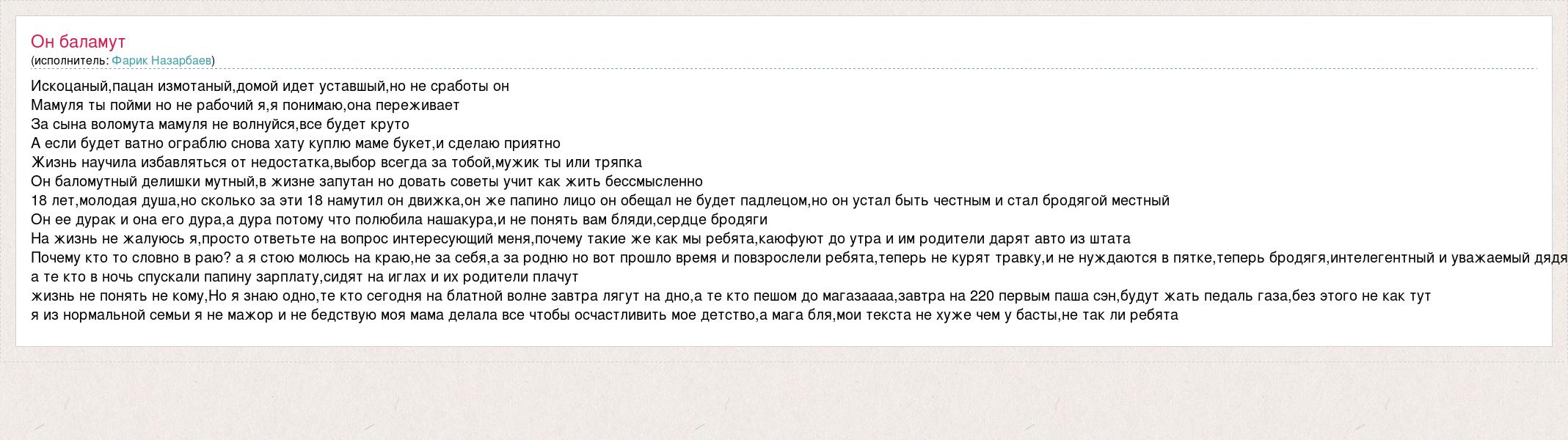 Искоцаный,пацан измотаный,домой идет уставшый,но не сработы он Мамуля ты пойми но не рабочий я,я понимаю,она переживает За сына воломута мамуля не волнуйся,все будет круто А если будет ватно ограблю снова хату куплю маме букет,и сделаю приятно Жизнь научила избавляться от недостатка,выбор всегда за тобой,мужик ты или тряпка Он баломутный делишки мутный,в жизне запутан но довать советы учит как жить бессмысленно 18 лет,молодая душа,но сколько за эти 18 намутил он движка,он же папино лицо он обещал не будет падлецом,но он устал быть честным и стал бродягой местный Он ее дурак и она его дура,а дура потому что полюбила нашакура,и не понять вам бляди,сердце бродяги На жизнь не жалуюсь я,просто ответьте на вопрос интересующий меня,почему такие же как мы ребята,каюфуют до утра и им родители дарят авто из штата Почему кто то словно в раю? а я стою молюсь на краю,не за себя,а за родню но вот прошло время и повзрослели ребята,теперь не курят травку,и не нуждаются в пятке,теперь бродягя,интелегентный и уважаемый дядя а те кто в ночь спускали папину зарплату,сидят на иглах и их родители плачут жизнь не понять не кому,Но я знаю одно,те кто сегодня на блатной волне завтра лягут на дно,а те кто пешом до магазаааа,завтра на 220 первым паша сэн,будут жать педаль газа,без этого не как тут я из нормальной семьи я не мажор и не бедствую моя мама делала все чтобы осчастливить мое детство,а мага бля,мои текста не хуже чем у басты,не так ли ребята