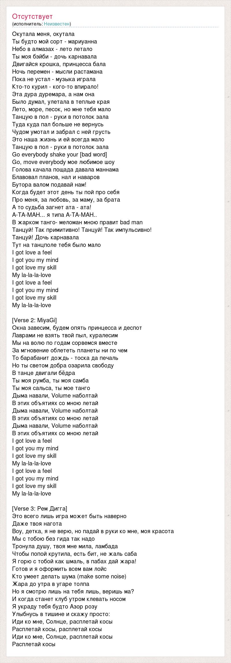 Окутала меня, окутала Ты будто мой сорт - мариуанна Небо в алмазах - лето летало Ты моя бэйби - дочь карнавала Двигайся крошка, принцесса бала Ночь перемен - мысли растамана Пока не устал - музыка играла Кто-то курил - кого-то впирало! Эта дура дуремара, а нам она Было думал, улетала в теплые края Лето, море, песок, но мне тебя мало Танцую в пол - руки в потолок зала Туда куда пал больше не вернусь Чудом умотал и забрал с ней грусть Это наша жизнь и ей всегда мало Танцую в пол - руки в потолок зала Go everybody shake your [bad word] Go, move everybody мое любимое шоу Голова качала пощада давала маннама Блавовал планов, нал и наваров Бутора валом подавай нам! Когда будет этот день ты пой про себя Про меня, за любовь, за маму, за брата А то судьба загнет ата - ата! А-ТА-МАН... я типа А-ТА-МАН.. В жарком танго- меломан мною правит bad man Танцуй! Так примитивно! Танцуй! Так импульсивно! Танцуй! Дочь карнавала Тут на танцполе тебя было мало I got love a feel I got you my mind I got love my skill My la-la-la-love I got love a feel I got you my mind I got love my skill My la-la-la-love [Verse 2: MiyaGi] Окна завесим, будем опять принцесса и деспот Лаврами не взять твой пыл, куралесим Мы на волю по годам сорвемся вместе За мгновение облететь планеты ни по чем То барабанит дождь - тоска да печаль Но ты светом добра озарила свободу В танце двигали бёдра Ты моя румба, ты моя самба Ты моя сальса, ты мое танго Дыма навали, Volume наболтай В этих объятиях со мною летай Дыма навали, Volume наболтай В этих объятиях со мною летай Дыма навали, Volume наболтай В этих объятиях со мною летай I got love a feel I got you my mind I got love my skill My la-la-la-love I got love a feel I got you my mind I got love my skill My la-la-la-love [Verse 3: Рем Дигга] Это всего лишь игра может быть наверно Даже твоя нагота Воу, детка, я не верю, но падай в руки ко мне, моя красота Мы с тобою без гида так надо Тронула душу, твоя мне мила, ламбада Чтобы попой крутила, есть бит, не жаль саба Я горю с тобой как шмаль, в пабах дай жара! Готов и я оформить всем вам лойс Кто умеет делать шума (make some noise) Жара до утра в угаре толпа Но я смотрю лишь на тебя лишь, веришь ма? И когда станет клуб утром клевать носом Я украду тебя будто Азор розу Улыбнусь в тишине и скажу просто: Иди ко мне, Солнце, расплетай косы Расплетай косы, расплетай косы Иди ко мне, Солнце, расплетай косы Расплетай косы