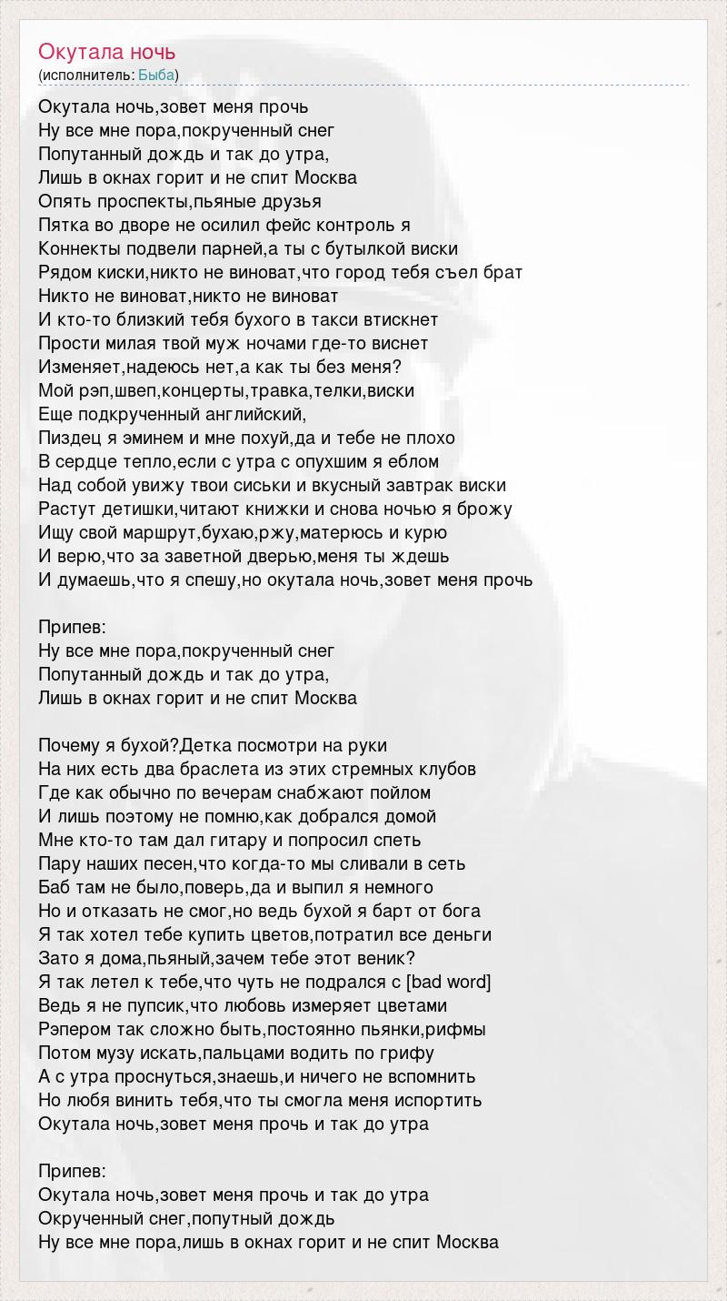 Окутала ночь,зовет меня прочь Ну все мне пора,покрученный снег Попутанный дождь и так до утра, Лишь в окнах горит и не спит Москва Опять проспекты,пьяные друзья Пятка во дворе не осилил фейс контроль я Коннекты подвели парней,а ты с бутылкой виски Рядом киски,никто не виноват,что город тебя съел брат Никто не виноват,никто не виноват И кто-то близкий тебя бухого в такси втискнет Прости милая твой муж ночами где-то виснет Изменяет,надеюсь нет,а как ты без меня? Мой рэп,швеп,концерты,травка,телки,виски Еще подкрученный английский, Пиздец я эминем и мне похуй,да и тебе не плохо В сердце тепло,если с утра с опухшим я еблом Над собой увижу твои сиськи и вкусный завтрак виски Растут детишки,читают книжки и снова ночью я брожу Ищу свой маршрут,бухаю,ржу,матерюсь и курю И верю,что за заветной дверью,меня ты ждешь И думаешь,что я спешу,но окутала ночь,зовет меня прочь Припев: Ну все мне пора,покрученный снег Попутанный дождь и так до утра, Лишь в окнах горит и не спит Москва Почему я бухой?Детка посмотри на руки На них есть два браслета из этих стремных клубов Где как обычно по вечерам снабжают пойлом И лишь поэтому не помню,как добрался домой Мне кто-то там дал гитару и попросил спеть Пару наших песен,что когда-то мы сливали в сеть Баб там не было,поверь,да и выпил я немного Но и отказать не смог,но ведь бухой я барт от бога Я так хотел тебе купить цветов,потратил все деньги Зато я дома,пьяный,зачем тебе этот веник? Я так летел к тебе,что чуть не подрался с [bad word] Ведь я не пупсик,что любовь измеряет цветами Рэпером так сложно быть,постоянно пьянки,рифмы Потом музу искать,пальцами водить по грифу А с утра проснуться,знаешь,и ничего не вспомнить Но любя винить тебя,что ты смогла меня испортить Окутала ночь,зовет меня прочь и так до утра Припев: Окутала ночь,зовет меня прочь и так до утра Окрученный снег,попутный дождь Ну все мне пора,лишь в окнах горит и не спит Москва