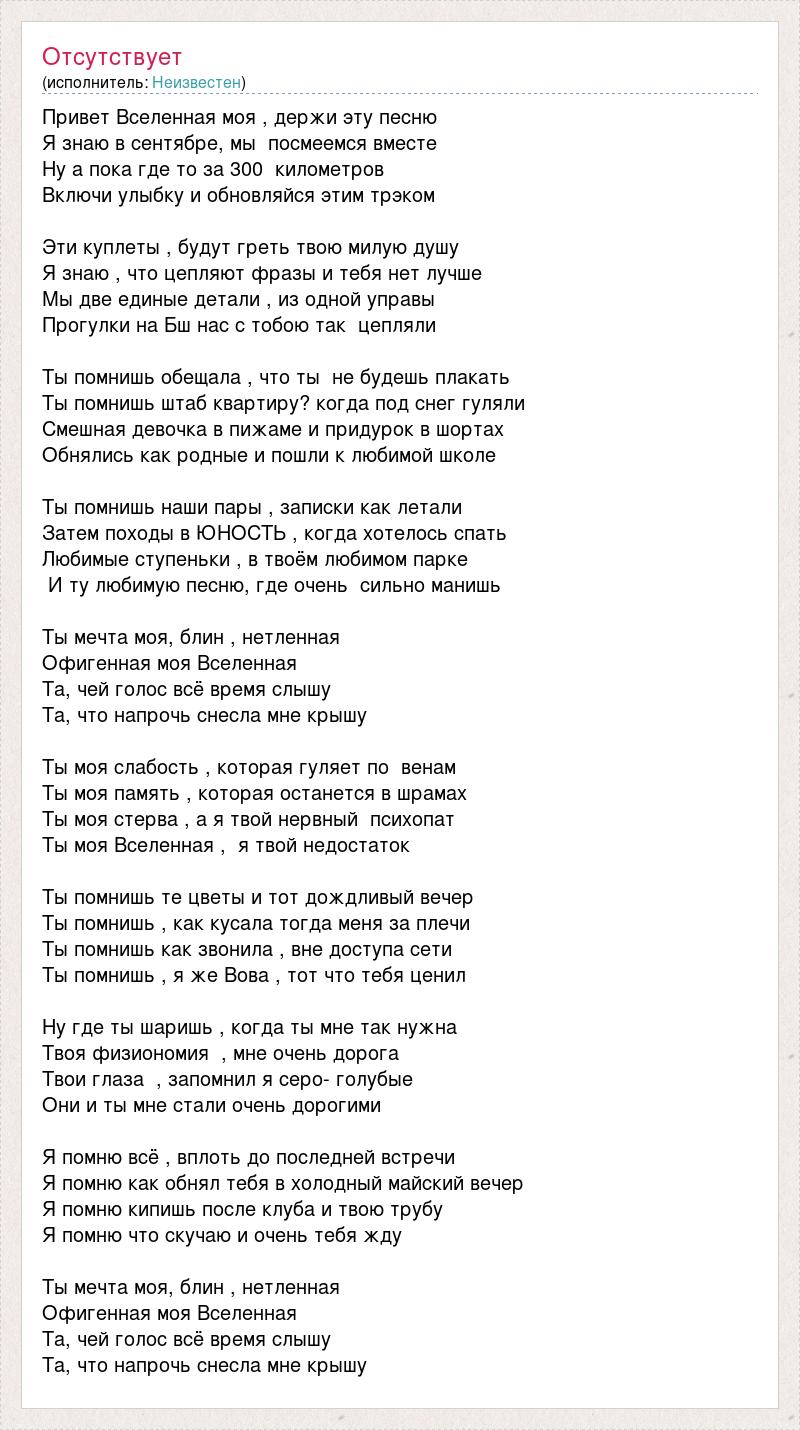 Привет Вселенная моя , держи эту песню Я знаю в сентябре, мы посмеемся вместе Ну а пока где то за 300 километров Включи улыбку и обновляйся этим трэком Эти куплеты , будут греть твою милую душу Я знаю , что цепляют фразы и тебя нет лучше Мы две единые детали , из одной управы Прогулки на Бш нас с тобою так цепляли Ты помнишь обещала , что ты не будешь плакать Ты помнишь штаб квартиру? когда под снег гуляли Смешная девочка в пижаме и придурок в шортах Обнялись как родные и пошли к любимой школе Ты помнишь наши пары , записки как летали Затем походы в ЮНОСТЬ , когда хотелось спать Любимые ступеньки , в твоём любимом парке И ту любимую песню, где очень сильно манишь Ты мечта моя, блин , нетленная Офигенная моя Вселенная Та, чей голос всё время слышу Та, что напрочь снесла мне крышу Ты моя слабость , которая гуляет по венам Ты моя память , которая останется в шрамах Ты моя стерва , а я твой нервный психопат Ты моя Вселенная , я твой недостаток Ты помнишь те цветы и тот дождливый вечер Ты помнишь , как кусала тогда меня за плечи Ты помнишь как звонила , вне доступа сети Ты помнишь , я же Вова , тот что тебя ценил Ну где ты шаришь , когда ты мне так нужна Твоя физиономия , мне очень дорога Твои глаза , запомнил я серо- голубые Они и ты мне стали очень дорогими Я помню всё , вплоть до последней встречи Я помню как обнял тебя в холодный майский вечер Я помню кипишь после клуба и твою трубу Я помню что скучаю и очень тебя жду Ты мечта моя, блин , нетленная Офигенная моя Вселенная Та, чей голос всё время слышу Та, что напрочь снесла мне крышу