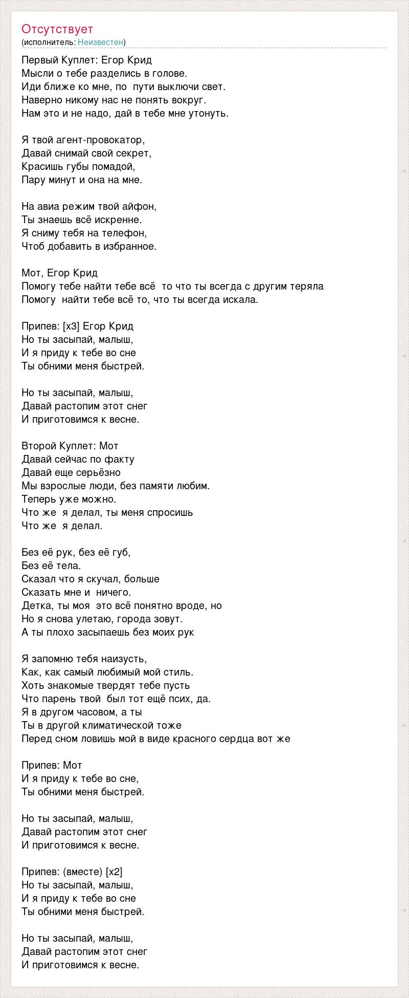 Первый Куплет: Егор Крид Мысли о тебе разделись в голове. Иди ближе ко мне, по пути выключи свет. Наверно никому нас не понять вокруг. Нам это и не надо, дай в тебе мне утонуть. Я твой агент-провокатор, Давай снимай свой секрет, Красишь губы помадой, Пару минут и она на мне. На авиа режим твой айфон, Ты знаешь всё искренне. Я сниму тебя на телефон, Чтоб добавить в избранное. Мот, Егор Крид Помогу тебе найти тебе всё то что ты всегда с другим теряла Помогу найти тебе всё то, что ты всегда искала. Припев: [х3] Егор Крид Но ты засыпай, малыш, И я приду к тебе во сне Ты обними меня быстрей. Но ты засыпай, малыш, Давай растопим этот снег И приготовимся к весне. Второй Куплет: Мот Давай сейчас по факту Давай еще серьёзно Мы взрослые люди, без памяти любим. Теперь уже можно. Что же я делал, ты меня спросишь Что же я делал. Без её рук, без её губ, Без её тела. Сказал что я скучал, больше Сказать мне и ничего. Детка, ты моя это всё понятно вроде, но Но я снова улетаю, города зовут. А ты плохо засыпаешь без моих рук Я запомню тебя наизусть, Как, как самый любимый мой стиль. Хоть знакомые твердят тебе пусть Что парень твой был тот ещё псих, да. Я в другом часовом, а ты Ты в другой климатической тоже Перед сном ловишь мой в виде красного сердца вот же Припев: Мот И я приду к тебе во сне, Ты обними меня быстрей. Но ты засыпай, малыш, Давай растопим этот снег И приготовимся к весне. Припев: (вместе) [х2] Но ты засыпай, малыш, И я приду к тебе во сне Ты обними меня быстрей. Но ты засыпай, малыш, Давай растопим этот снег И приготовимся к весне.