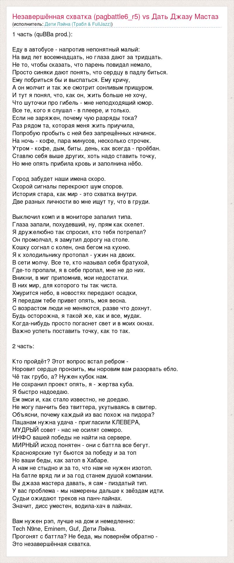1 часть (quBBa prod.): Еду в автобусе - напротив непонятный малый: На вид лет восемнадцать, но глаза дают за тридцать. Не то, чтобы сказать, что парень повидал немало, Просто синяки дают понять, что сердцу в падлу биться. Ему побриться бы и выспаться. Ему кричу, А он молчит и так же смотрит сонливым прищуром. И тут я понял, что, как он, жить больше не хочу, Что шуточки про гибель - мне неподходящий юмор. Все те, кого я слушал - в плеере, и только. Если не заряжен, почему чую разряды тока? Раз рядом та, которая меня жить приучила, Попробую пробыть с ней без запрещённых начинок. На ночь - кофе, пара минусов, несколько строчек. Утром - кофе, дым, биты. день, как всегда - проёбан. Ставлю себя выше других, хоть надо ставить точку, Но мне опять прибила кровь и заполнина нёбо. Город забудет наши имена скоро. Скорой сигналы перекроют шум споров. История стара, как мир - это схватка внутри. Две разных личности во мне ищут ту, что в груди. Выключил комп и в мониторе запалил типа. Глаза запали, похудевший, ну, прям как скелет. Я дружелюбно так спросил, кто тебя потрепал? Он промолчал, я замутил дорогу на столе. Кошку согнал с колен, она бегом на кухню. Я к холодильнику протопал - ужин на двоих. В сети молчу. Все те, кто называл себя братухой, Где-то пропали, я в себе пропал, мне не до них. Вникни, в миг припомнив, мои недостатки. В них мир, для которого ты так чиста. Хмурится небо, в новостях передают осадки, Я передам тебе привет опять, моя весна. С возрастом люди не меняются, разве что дохнут. Будь осторожна, я такой же, как и все, мудак. Когда-нибудь просто погаснет свет и в моих окнах. Важно успеть поставить точку, как то так. 2 часть: Кто пройдёт? Этот вопрос встал ребром - Норовит сердце пронзить, мы норовим вам разорвать ебло. Чё так грубо, а? Нужен кубок нам. Не сохранил проект опять, я - жертва куба. Я быстро надоедаю. Ем эмси и, как стало известно, не доедаю. Не могу панчить без твиттера, укутываясь в свитер. Объясни, почему каждый из вас похож на пидора? Пацанам нужна удача - пригласили КЛЕВЕРА, МУДРЫЙ совет - нас не осилят семеро. ИНФО вашей победы не найти на сервере. МИРНЫЙ исход понятен - они с баттла все бегут. Красноярские тут бьются за победу и за топ Но ваши беды, как затоп в Хабаре. А нам не стыдно и за то, что нам не нужен изотоп. На батле вряд ли и за год станем душой компании. Вы джаза мастера давать, я сам - пиздатый тип. У вас проблема - мы намерены дальше к звёздам идти. Судьи ожидают треков на панч-лайнах. Значит, дисс уместен, водила-хач в лайнах. Вам нужен рэп, лучше на дом и немедленно: Tech N9ne, Eminem, Guf, Дети Лэйна. Прогонят с баттла? Не беда, мы повернём обратно - Это незавершённая схватка.