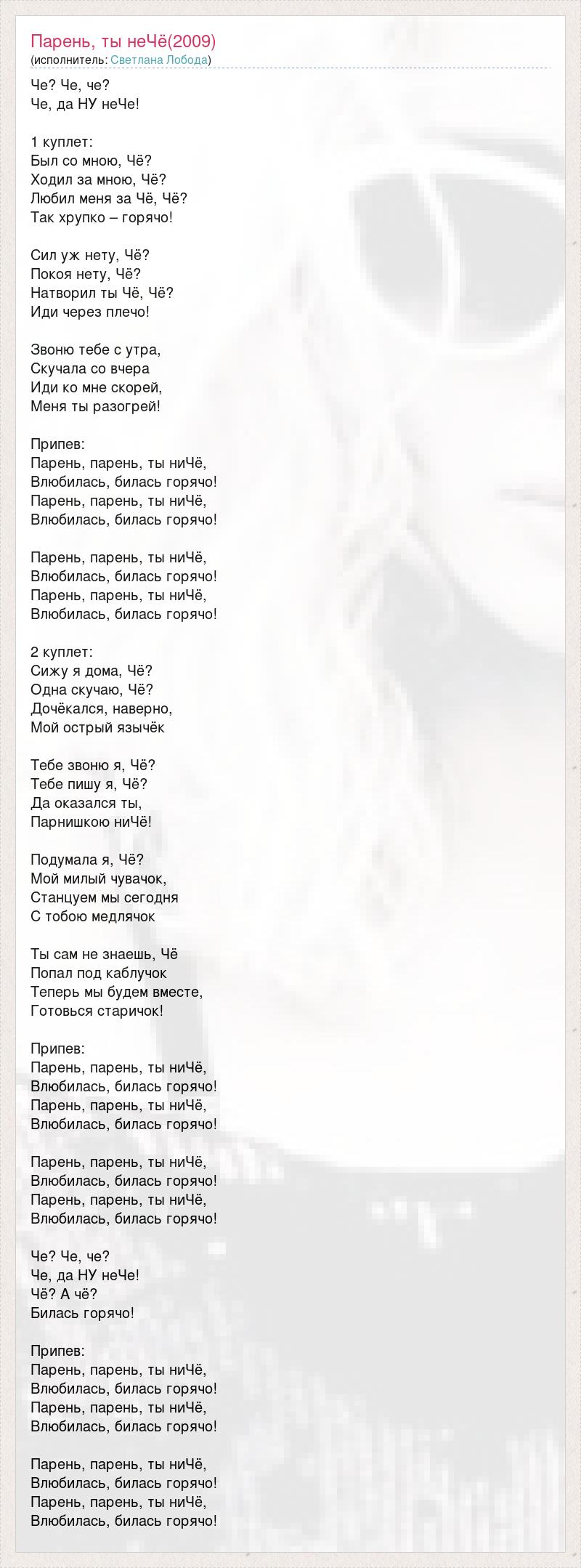 Че? Че, че? Че, да НУ неЧе! 1 куплет: Был со мною, Чё? Ходил за мною, Чё? Любил меня за Чё, Чё? Так хрупко – горячо! Сил уж нету, Чё? Покоя нету, Чё? Натворил ты Чё, Чё? Иди через плечо! Звоню тебе с утра, Скучала со вчера Иди ко мне скорей, Меня ты разогрей! Припев: Парень, парень, ты ниЧё, Влюбилась, билась горячо! Парень, парень, ты ниЧё, Влюбилась, билась горячо! Парень, парень, ты ниЧё, Влюбилась, билась горячо! Парень, парень, ты ниЧё, Влюбилась, билась горячо! 2 куплет: Сижу я дома, Чё? Одна скучаю, Чё? Дочёкался, наверно, Мой острый язычёк Тебе звоню я, Чё? Тебе пишу я, Чё? Да оказался ты, Парнишкою ниЧё! Подумала я, Чё? Мой милый чувачок, Станцуем мы сегодня С тобою медлячок Ты сам не знаешь, Чё Попал под каблучок Теперь мы будем вместе, Готовься старичок! Припев: Парень, парень, ты ниЧё, Влюбилась, билась горячо! Парень, парень, ты ниЧё, Влюбилась, билась горячо! Парень, парень, ты ниЧё, Влюбилась, билась горячо! Парень, парень, ты ниЧё, Влюбилась, билась горячо! Че? Че, че? Че, да НУ неЧе! Чё? А чё? Билась горячо! Припев: Парень, парень, ты ниЧё, Влюбилась, билась горячо! Парень, парень, ты ниЧё, Влюбилась, билась горячо! Парень, парень, ты ниЧё, Влюбилась, билась горячо! Парень, парень, ты ниЧё, Влюбилась, билась горячо!