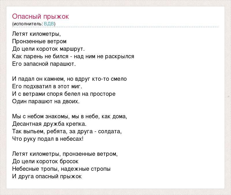 Летят километры, Пронзенные ветром До цели короток маршрут. Как парень не бился - над ним не раскрылся Его запасной парашют. И падал он камнем, но вдруг кто-то смело Его подхватил в этот миг. И с ветрами споря белел на просторе Один парашют на двоих. Мы с небом знакомы, мы в небе, как дома, Десантная дружба крепка. Так выпьем, ребята, за друга - солдата, Что руку подал в небесах! Летят километры, пронзенные ветром, До цели короток бросок Небесные тропы, надежные стропы И друга опасный прыжок