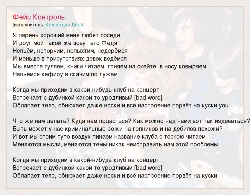 Я парень хороший меня любят соседи И друг мой такой же зовут его Федя Непьём, неторчим, непыхтим, недерёмся И меньше в присутствиях девок ведёмся Мы вместе гуляем, книги читаем, гоняем на скейте, в носу ковыряем Напьёмся кефиру и скачим по лужам Когда мы приходим в какой-нибудь клуб на концерт Встречает с дубинкой какой то уродливый [bad word] Облапает тело, обнюхает даже носки и всё настроение порвёт на куски you Что же нам делать? Куда нам подасться? Как можно над нами вот так издеваться? Быть может у нас криминальные рожи на гопников и на дебилов похожи? И вот мы стоим тупо воздух пинаем название клуба с тоскою читаем Меняются мысли, меняются темы никак неисправить нам этой проблемы Когда мы приходим в какой-нибудь клуб на концерт Встречает с дубинкой какой то уродливый [bad word] Облапает тело, обнюхает даже носки и всё настроение порвёт на куски