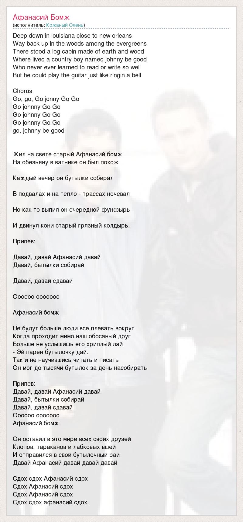Deep down in louisiana close to new orleans Way back up in the woods among the evergreens There stood a log cabin made of earth and wood Where lived a country boy named johnny be good Who never ever learned to read or write so well But he could play the guitar just like ringin a bell Chorus Go, go, Go jonny Go Go Go johnny Go Go Go johnny Go Go Go johnny Go Go go, johnny be good Жил на свете старый Афанасий бомж На обезьяну в ватнике он был похож Каждый вечер он бутылки собирал В подвалах и на тепло - трассах ночевал Но как то выпил он очередной фунфырь И двинул кони старый грязный колдырь. Припев: Давай, давай Афанасий давай Давай, бытылки собирай Давай, давай сдавай Оооооо ооооооо Афанасий бомж Не будут больше люди все плевать вокруг Когда проходит мимо наш обосаный друг Больше не услышишь его хриплый лай - Эй парен бутылочку дай. Так и не научившись читать и писать Он мог до тысячи бутылок за день насобирать Припев: Давай, давай Афанасий давай Давай, бытылки собирай Давай, давай сдавай Оооооо ооооооо Афанасий бомж Он оставил в это мире всех своих друзей Клопов, тараканов и лабковых вшей И отправился в свой бутылочный рай Давай Афанасий давай давай давай Сдох сдох Афанасий сдох Сдох Афанасий сдох Сдох Афанасий сдох Сдох сдох афанасий сдох.