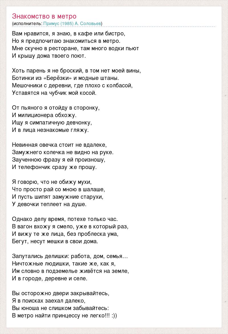 Вам нравится, я знаю, в кафе или бистро, Но я предпочитаю знакомиться в метро. Мне скучно в ресторане, там много водки пьют И крышу дома твоего поют. Хоть парень я не броский, в том нет моей вины, Ботинки из «Берёзки» и модные штаны. Мешочники с деревни, где плохо с колбасой, Уставятся на чубчик мой косой. От пьяного я отойду в сторонку, И милиционера обхожу. Ищу я симпатичную девчонку, И в лица незнакомые гляжу. Невинная овечка стоит не вдалеке, Замужнего колечка не видно на руке. Заученною фразу я ей произношу, И телефончик сразу же прошу. Я говорю, что не обижу мухи, Что просто рай со мною в шалаше, И пусть шипят замужние старухи, У девочки теплеет на душе. Однако делу время, потехе только час. В вагон вхожу я смело, уже в который раз, И вижу те же лица, без проблеска ума, Бегут, несут мешки в свои дома. Запутались делишки: работа, дом, семья… Ничтожные людишки, такие же, как я, Им словно в подземелье живётся на земле, И в городе, деревне и селе. Вы осторожно двери закрывайтесь, Я в поисках заехал далеко, Вы юноша не слишком забывайтесь: В метро найти принцессу не легко!!! :))