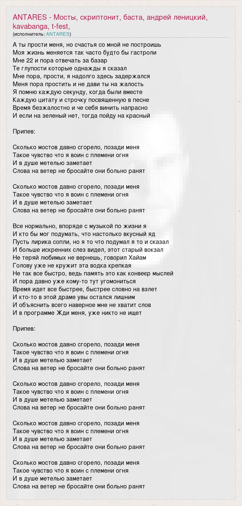 А ты прости меня, но счастья со мной не построишь Моя жизнь меняется так часто будто бы гастроли Мне 22 и пора отвечать за базар Те глупости которые однажды я сказал Мне пора, прости, я надолго здесь задержался Меня пора простить и не дави ты на жалость Я помню каждую секунду, когда были вместе Каждую цитату и строчку посвященную в песне Время безжалостно и че себя винить напрасно И если на зеленый нет, тогда пойду на красный Припев: Сколько мостов давно сгорело, позади меня Такое чувство что я воин с племени огня И в душе метелью заметает Слова на ветер не бросайте они больно ранят Сколько мостов давно сгорело, позади меня Такое чувство что я воин с племени огня И в душе метелью заметает Слова на ветер не бросайте они больно ранят Все нормально, впоряде с музыкой по жизни я И кто бы мог подумать, что настолько вкусный яд Пусть лирика сопли, но я то что подумал я то и сказал И больше искренних слез видел, этот старый вокзал Не теряй любимых не вернешь, говорил Хайам Голову уже не кружит эта водка крепкая Не так все быстро, ведь память это как конвеєр мыслей И пора давно уже кому-то тут угомониться Время идет все быстрее, быстрее словно на взлет И кто-то в этой драме увы остался лишним И объяснить всего наверное мне не хватит слов И в программе Жди меня, уже никто не ищет Припев: Сколько мостов давно сгорело, позади меня Такое чувство что я воин с племени огня И в душе метелью заметает Слова на ветер не бросайте они больно ранят Сколько мостов давно сгорело, позади меня Такое чувство что я воин с племени огня И в душе метелью заметает Слова на ветер не бросайте они больно ранят Сколько мостов давно сгорело, позади меня Такое чувство что я воин с племени огня И в душе метелью заметает Слова на ветер не бросайте они больно ранят Сколько мостов давно сгорело, позади меня Такое чувство что я воин с племени огня И в душе метелью заметает Слова на ветер не бросайте они больно ранят