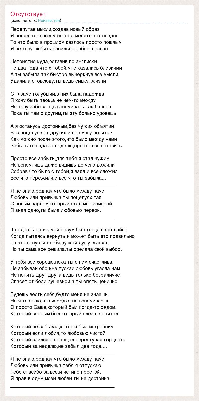 Перепутав мысли,создав новый образ Я понял что сосвем не та,а менять так поздно То что было в прошлом,казлось просто пошлым Я не хочу любить насильно,тобою послан Непонятно куда,оставив по англиски Те два года что с тобой,мне казались близкими А ты забыла так быстро,вычеркнув все мысли Удалила отовсюду,ты ведь смысл жизни С глзами голубыми,в них была надежда Я хочу быть твом,а не чем-то между Не хочу забывать,в вспоминать так больно Пока ты там с другим,ты эту больно удовешь А я останусь достойным,без чужих объятий Без поцелуев от других,и не смогу понять я Как можно после этого,что было между нами Забыть те года за неделю,просто все оставить Просто все забыть,для тебя я стал чужим Не вспомнишь даже,видишь до чего дожили Собрав что было с тобой,я взял и все сложил Все что пережили,и все что ты забыла... _______________________________________ Я не знаю,родная,что было между нами Любовь или привычка,ты поцелуях тая С новым парнем,который стал мне заменой. Я знал одно,ты была любовью первой. ______________________________________ Гордость прочь,мой разум был тогда в оф лайне Когда пытаясь вернуть,и может быть это правильно То что отпустил тебя,пускай душу вырвал Но ты сама все решила,ты сделала свой выбор. У тебя все хорошо,пока ты с ним счастлива. Не забывай обо мне,пускай любовь угасла нам Не понять друг друга,ведь только безраличие Спасет от боли душевной,а ты опять ценично Будешь вести себя,будто меня не знаешь. Но я то знаю,что изредка но вспоминаешь О просто Саше,который был когда-то рядом. Который верным был,который слез не прятал. Который не забывал,которы был искренним Который если любил,то любовью чистой Который злился но прощал,переступая гордость Который за неделю,не забыл два года.... _______________________________________ Я не знаю,родная,что было между нами Любовь или привычка,тебя я отпускаю Тебе спасибо за все,и истине простой. Я прав в однм,моей любви ты не достойна. ______________________________________