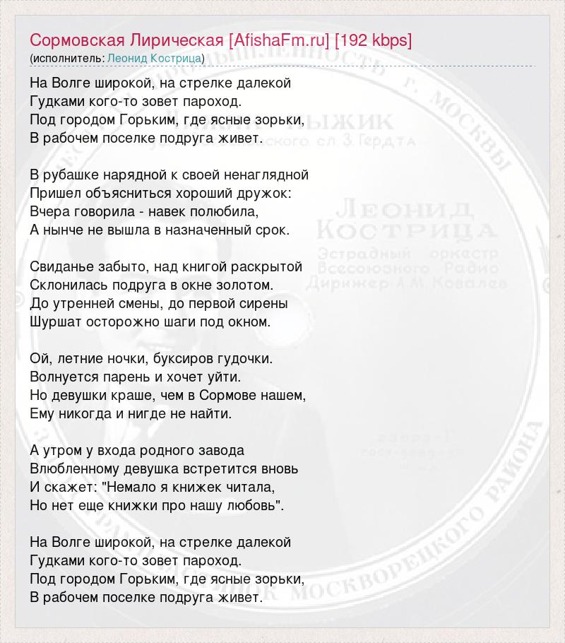 На Волге широкой, на стрелке далекой Гудками кого-то зовет пароход. Под городом Горьким, где ясные зорьки, В рабочем поселке подруга живет. В рубашке нарядной к своей ненаглядной Пришел объясниться хороший дружок: Вчера говорила - навек полюбила, А нынче не вышла в назначенный срок. Свиданье забыто, над книгой раскрытой Склонилась подруга в окне золотом. До утренней смены, до первой сирены Шуршат осторожно шаги под окном. Ой, летние ночки, буксиров гудочки. Волнуется парень и хочет уйти. Но девушки краше, чем в Сормове нашем, Ему никогда и нигде не найти. А утром у входа родного завода Влюбленному девушка встретится вновь И скажет: "Немало я книжек читала, Но нет еще книжки про нашу любовь". На Волге широкой, на стрелке далекой Гудками кого-то зовет пароход. Под городом Горьким, где ясные зорьки, В рабочем поселке подруга живет.