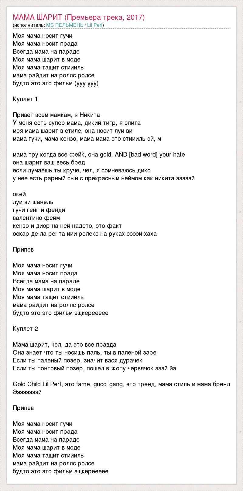 Моя мама носит гучи Моя мама носит прада Всегда мама на параде Моя мама шарит в моде Моя мама тащит стиииль мама райдит на роллс ролсе будто это это фильм (ууу ууу) Куплет 1 Привет всем мамкам, я Никита У меня есть супер мама, дикий тигр, я элита моя мама шарит в стиле, она носит луи ви мама гучи, мама кензо, мама мама это стиииль эй, м мама тру когда все фейк, она gold, AND [bad word] your hate она шарит ваш весь бред если думаешь ты круче, чел, я сомневаюсь дико у нее есть рарный сын с прекрасным неймом как никита эээээй окей луи ви шанель гучи генг и фенди валентино фейм кензо и диор на ней надето, это факт оскар де ла рента иии ролекс на руках ээээй хаха Припев Моя мама носит гучи Моя мама носит прада Всегда мама на параде Моя мама шарит в моде Моя мама тащит стиииль мама райдит на роллс ролсе будто это это фильм эщкереееее Куплет 2 Мама шарит, чел, да это все правда Она знает что ты носишь паль, ты в паленой заре Если ты паленый позер, значит вася дурачек Если ты понтовый позер, пошел в жопу червячок эээй йа Gold Child Lil Perf, это fame, gucci gang, это тренд, мама стиль и мама бренд Ээээээээй Припев Моя мама носит гучи Моя мама носит прада Всегда мама на параде Моя мама шарит в моде Моя мама тащит стиииль мама райдит на роллс ролсе будто это это фильм эщкереееее