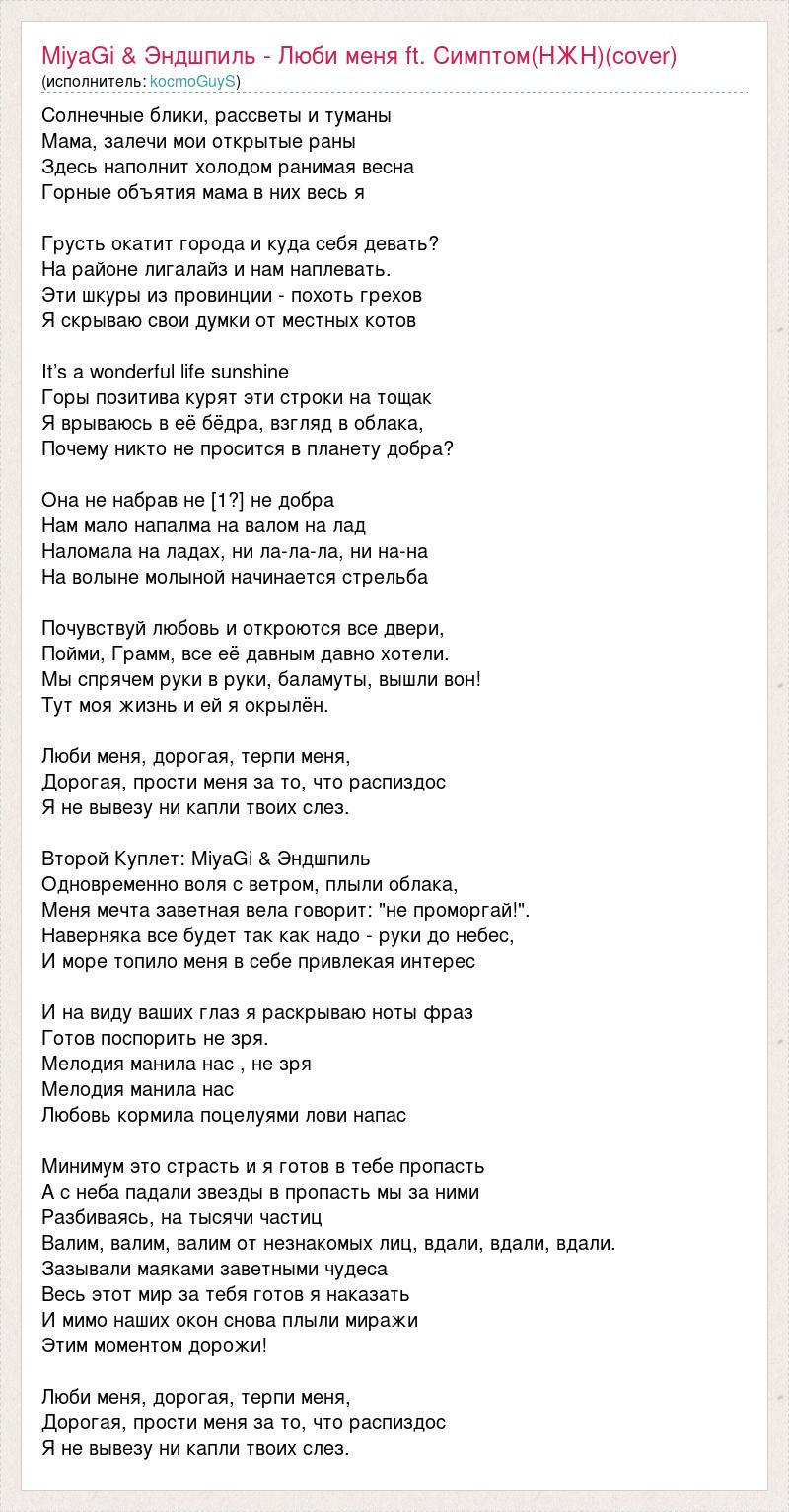 Солнечные блики, рассветы и туманы Мама, залечи мои открытые раны Здесь наполнит холодом ранимая весна Горные объятия мама в них весь я Грусть окатит города и куда себя девать? На районе лигалайз и нам наплевать. Эти шкуры из провинции - похоть грехов Я скрываю свои думки от местных котов It’s a wonderful life sunshine Горы позитива курят эти строки на тощак Я врываюсь в её бёдра, взгляд в облака, Почему никто не просится в планету добра? Она не набрав не [1?] не добра Нам мало напалма на валом на лад Наломала на ладах, ни ла-ла-ла, ни на-на На волыне молыной начинается стрельба Почувствуй любовь и откроются все двери, Пойми, Грамм, все её давным давно хотели. Мы спрячем руки в руки, баламуты, вышли вон! Тут моя жизнь и ей я окрылён. Люби меня, дорогая, терпи меня, Дорогая, прости меня за то, что распиздос Я не вывезу ни капли твоих слез. Второй Куплет: MiyaGi & Эндшпиль Одновременно воля с ветром, плыли облака, Меня мечта заветная вела говорит: "не проморгай!". Наверняка все будет так как надо - руки до небес, И море топило меня в себе привлекая интерес И на виду ваших глаз я раскрываю ноты фраз Готов поспорить не зря. Мелодия манила нас , не зря Мелодия манила нас Любовь кормила поцелуями лови напас Минимум это страсть и я готов в тебе пропасть А с неба падали звезды в пропасть мы за ними Разбиваясь, на тысячи частиц Валим, валим, валим от незнакомых лиц, вдали, вдали, вдали. Зазывали маяками заветными чудеса Весь этот мир за тебя готов я наказать И мимо наших окон снова плыли миражи Этим моментом дорожи! Люби меня, дорогая, терпи меня, Дорогая, прости меня за то, что распиздос Я не вывезу ни капли твоих слез.