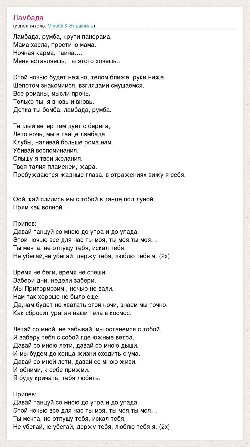 Ламбада, румба, крути панорама. Мама хасла, прости ю мама. Ночная карма, тайна…. Меня вставляешь, ты этого хочешь.. Этой ночью будет нежно, телом ближе, руки ниже. Шепотом знакомимся, взглядами смущаемся. Все романы, мысли прочь. Только ты, я вновь и вновь. Детка ты бомба, ламбада, румба. Теплый ветер там дует с берега, Лето ночь, мы в танце ламбада. Клубы, наливай больше рома нам. Убивай воспоминания. Слышу я твои желания. Твоя талия пламенем, жара. Пробуждаются жадные глаза, в отражениях вижу я себя. Оой, кай слились мы с тобой в танце под луной. Прям как волной. Припев: Давай танцуй со мною до утра и до упада. Этой ночью все для нас ты моя, ты моя,ты моя… Ты мечта, не отпущу тебя, искал тебя, Не убегай,не убегай, держу тебя, люблю тебя я. (2х) Время не беги, время не спеши. Забери дни, недели забери. Мы Притормозим , ночью не вали. Нам так хорошо не было еще. Да,нам будет не хватать этой ночи, знаем мы точно. Как сбросит ураган наши тела в космос. Летай со мной, не забывай, мы останемся с тобой. Я заберу тебя с собой где южные ветра. Давай со мною лети, давай со мною дыши. И мы будем до конца жизни сходить с ума. Давай со мной лети, давай со мною живи. И обними, к себе прижми. Я буду кричать, тебя любить. Припев: Давай танцуй со мною до утра и до упада. Этой ночью все для нас ты моя, ты моя,ты моя… Ты мечта, не отпущу тебя, искал тебя, Не убегай,не убегай, держу тебя, люблю тебя я. (2х)