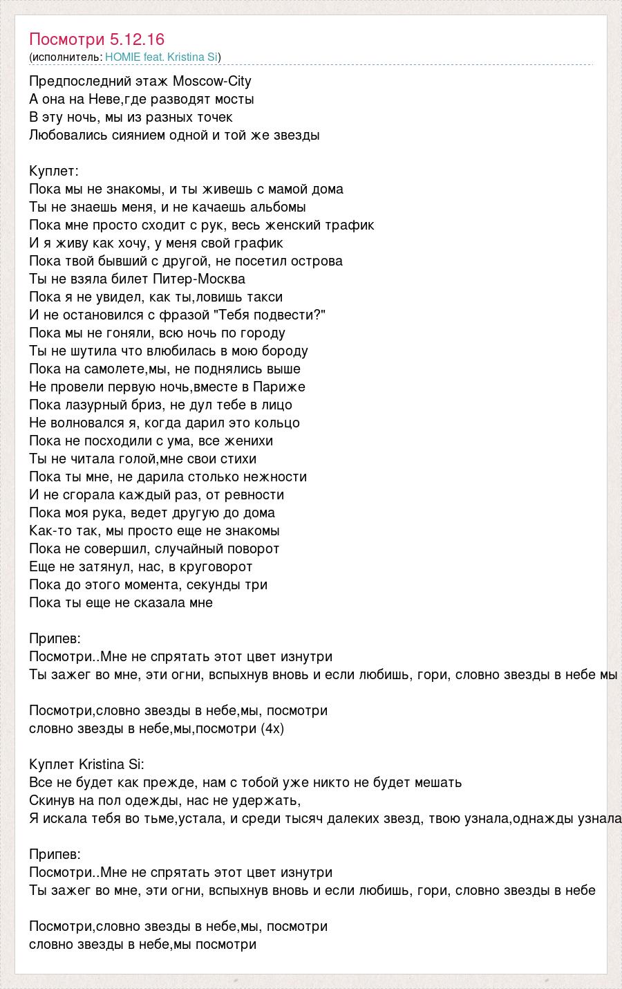 Предпоследний этаж Moscow-City А она на Неве,где разводят мосты В эту ночь, мы из разных точек Любовались сиянием одной и той же звезды Куплет: Пока мы не знакомы, и ты живешь с мамой дома Ты не знаешь меня, и не качаешь альбомы Пока мне просто сходит с рук, весь женский трафик И я живу как хочу, у меня свой график Пока твой бывший с другой, не посетил острова Ты не взяла билет Питер-Москва Пока я не увидел, как ты,ловишь такси И не остановился с фразой "Тебя подвести?" Пока мы не гоняли, всю ночь по городу Ты не шутила что влюбилась в мою бороду Пока на самолете,мы, не поднялись выше Не провели первую ночь,вместе в Париже Пока лазурный бриз, не дул тебе в лицо Не волновался я, когда дарил это кольцо Пока не посходили с ума, все женихи Ты не читала голой,мне свои стихи Пока ты мне, не дарила столько нежности И не сгорала каждый раз, от ревности Пока моя рука, ведет другую до дома Как-то так, мы просто еще не знакомы Пока не совершил, случайный поворот Еще не затянул, нас, в круговорот Пока до этого момента, секунды три Пока ты еще не сказала мне Припев: Посмотри..Мне не спрятать этот цвет изнутри Ты зажег во мне, эти огни, вспыхнув вновь и если любишь, гори, словно звезды в небе мы Посмотри,словно звезды в небе,мы, посмотри словно звезды в небе,мы,посмотри (4х) Куплет Kristina Si: Все не будет как прежде, нам с тобой уже никто не будет мешать Скинув на пол одежды, нас не удержать, Я искала тебя во тьме,устала, и среди тысяч далеких звезд, твою узнала,однажды узнала Припев: Посмотри..Мне не спрятать этот цвет изнутри Ты зажег во мне, эти огни, вспыхнув вновь и если любишь, гори, словно звезды в небе Посмотри,словно звезды в небе,мы, посмотри словно звезды в небе,мы посмотри
