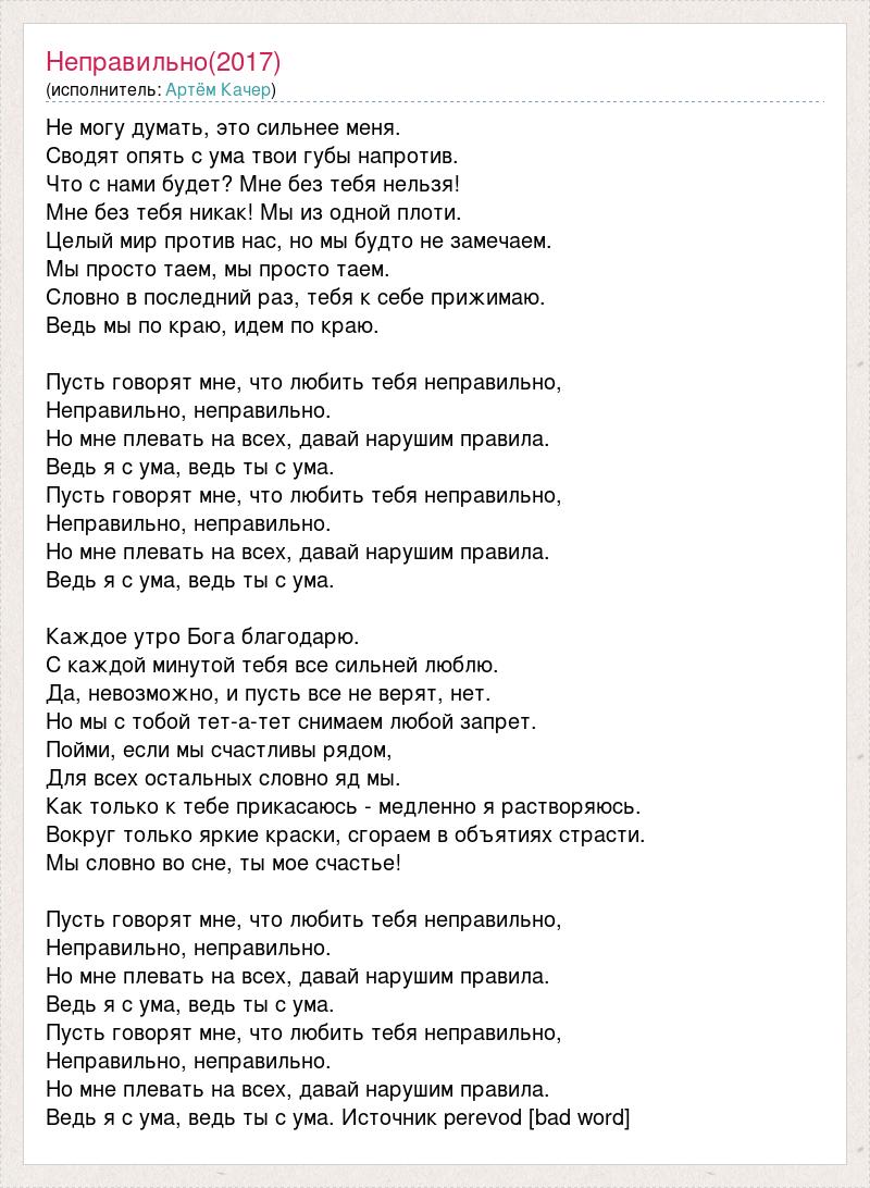 Не могу думать, это сильнее меня. Сводят опять с ума твои губы напротив. Что с нами будет? Мне без тебя нельзя! Мне без тебя никак! Мы из одной плоти. Целый мир против нас, но мы будто не замечаем. Мы просто таем, мы просто таем. Словно в последний раз, тебя к себе прижимаю. Ведь мы по краю, идем по краю. Пусть говорят мне, что любить тебя неправильно, Неправильно, неправильно. Но мне плевать на всех, давай нарушим правила. Ведь я с ума, ведь ты с ума. Пусть говорят мне, что любить тебя неправильно, Неправильно, неправильно. Но мне плевать на всех, давай нарушим правила. Ведь я с ума, ведь ты с ума. Каждое утро Бога благодарю. С каждой минутой тебя все сильней люблю. Да, невозможно, и пусть все не верят, нет. Но мы с тобой тет-а-тет снимаем любой запрет. Пойми, если мы счастливы рядом, Для всех остальных словно яд мы. Как только к тебе прикасаюсь - медленно я растворяюсь. Вокруг только яркие краски, сгораем в объятиях страсти. Мы словно во сне, ты мое счастье! Пусть говорят мне, что любить тебя неправильно, Неправильно, неправильно. Но мне плевать на всех, давай нарушим правила. Ведь я с ума, ведь ты с ума. Пусть говорят мне, что любить тебя неправильно, Неправильно, неправильно. Но мне плевать на всех, давай нарушим правила. Ведь я с ума, ведь ты с ума. Источник perevod [bad word]