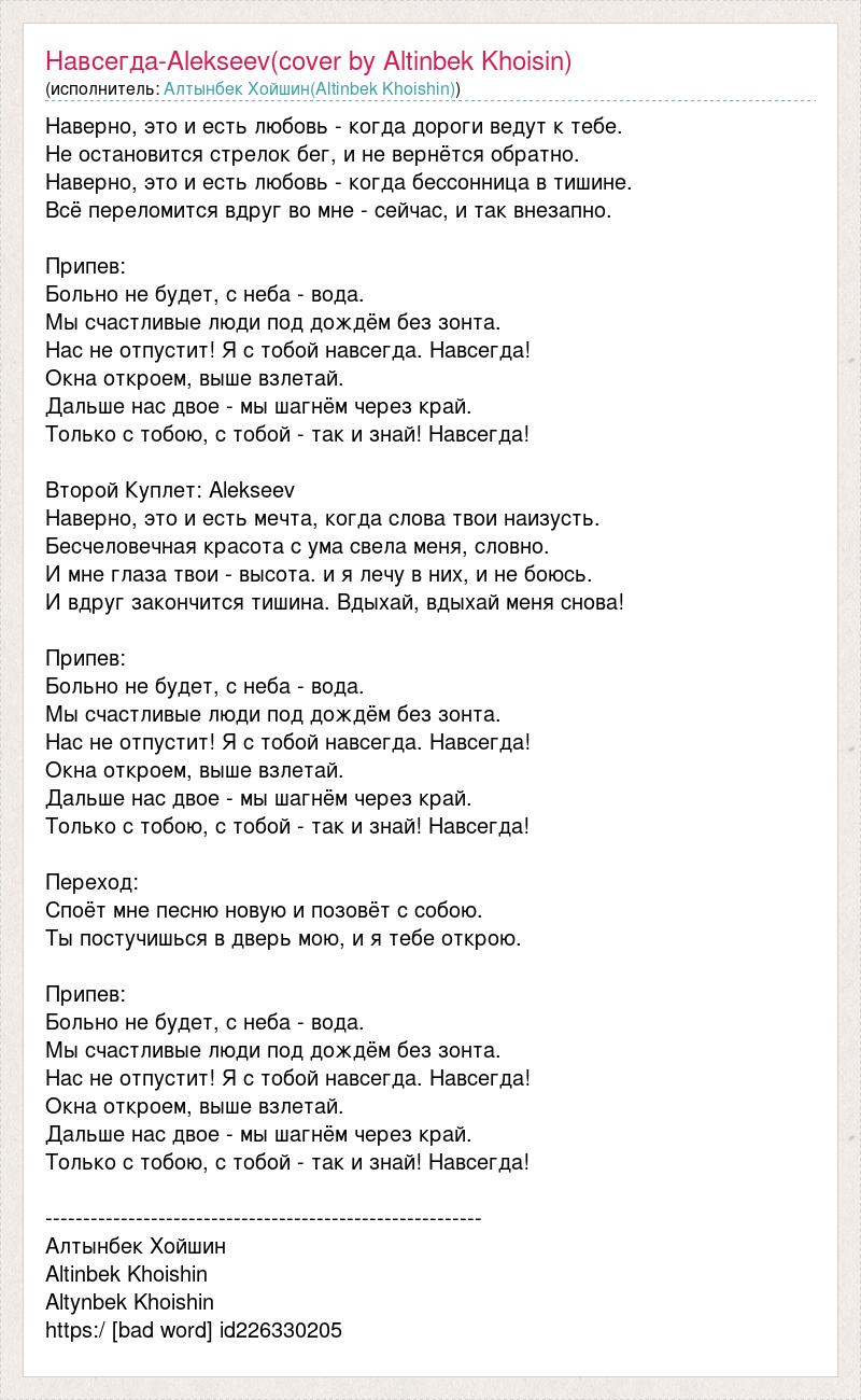 Наверно, это и есть любовь - когда дороги ведут к тебе. Не остановится стрелок бег, и не вернётся обратно. Наверно, это и есть любовь - когда бессонница в тишине. Всё переломится вдруг во мне - сейчас, и так внезапно. Припев: Больно не будет, с неба - вода. Мы счастливые люди под дождём без зонта. Нас не отпустит! Я с тобой навсегда. Навсегда! Окна откроем, выше взлетай. Дальше нас двое - мы шагнём через край. Только с тобою, с тобой - так и знай! Навсегда! Второй Куплет: Alekseev Наверно, это и есть мечта, когда слова твои наизусть. Бесчеловечная красота с ума свела меня, словно. И мне глаза твои - высота. и я лечу в них, и не боюсь. И вдруг закончится тишина. Вдыхай, вдыхай меня снова! Припев: Больно не будет, с неба - вода. Мы счастливые люди под дождём без зонта. Нас не отпустит! Я с тобой навсегда. Навсегда! Окна откроем, выше взлетай. Дальше нас двое - мы шагнём через край. Только с тобою, с тобой - так и знай! Навсегда! Переход: Споёт мне песню новую и позовёт с собою. Ты постучишься в дверь мою, и я тебе открою. Припев: Больно не будет, с неба - вода. Мы счастливые люди под дождём без зонта. Нас не отпустит! Я с тобой навсегда. Навсегда! Окна откроем, выше взлетай. Дальше нас двое - мы шагнём через край. Только с тобою, с тобой - так и знай! Навсегда! ---------------------------------------------------------- Алтынбек Хойшин Altinbek Khoishin Altynbek Khoishin https:/ [bad word] id226330205