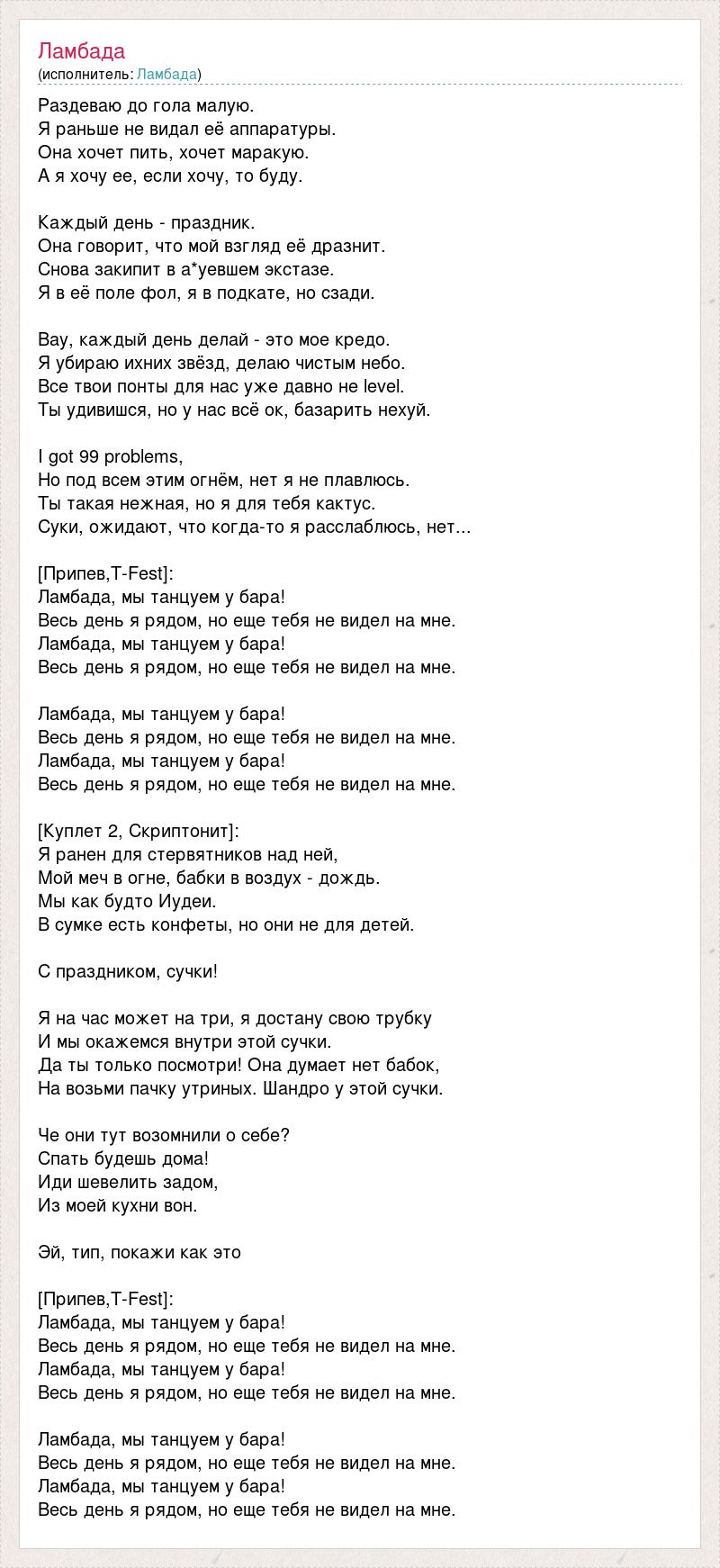Раздеваю до гола малую. Я раньше не видал её аппаратуры. Она хочет пить, хочет маракую. А я хочу ее, если хочу, то буду. Каждый день - праздник. Она говорит, что мой взгляд её дразнит. Снова закипит в а*уевшем экстазе. Я в её поле фол, я в подкате, но сзади. Вау, каждый день делай - это мое кредо. Я убираю ихних звёзд, делаю чистым небо. Все твои понты для нас уже давно не level. Ты удивишся, но у нас всё ок, базарить нехуй. I got 99 problems, Но под всем этим огнём, нет я не плавлюсь. Ты такая нежная, но я для тебя кактус. Суки, ожидают, что когда-то я расслаблюсь, нет... [Припев,T-Fest]: Ламбада, мы танцуем у бара! Весь день я рядом, но еще тебя не видел на мне. Ламбада, мы танцуем у бара! Весь день я рядом, но еще тебя не видел на мне. Ламбада, мы танцуем у бара! Весь день я рядом, но еще тебя не видел на мне. Ламбада, мы танцуем у бара! Весь день я рядом, но еще тебя не видел на мне. [Куплет 2, Скриптонит]: Я ранен для стервятников над ней, Мой меч в огне, бабки в воздух - дождь. Мы как будто Иудеи. В сумке есть конфеты, но они не для детей. С праздником, сучки! Я на час может на три, я достану свою трубку И мы окажемся внутри этой сучки. Да ты только посмотри! Она думает нет бабок, На возьми пачку утриных. Шандро у этой сучки. Че они тут возомнили о себе? Спать будешь дома! Иди шевелить задом, Из моей кухни вон. Эй, тип, покажи как это [Припев,T-Fest]: Ламбада, мы танцуем у бара! Весь день я рядом, но еще тебя не видел на мне. Ламбада, мы танцуем у бара! Весь день я рядом, но еще тебя не видел на мне. Ламбада, мы танцуем у бара! Весь день я рядом, но еще тебя не видел на мне. Ламбада, мы танцуем у бара! Весь день я рядом, но еще тебя не видел на мне.