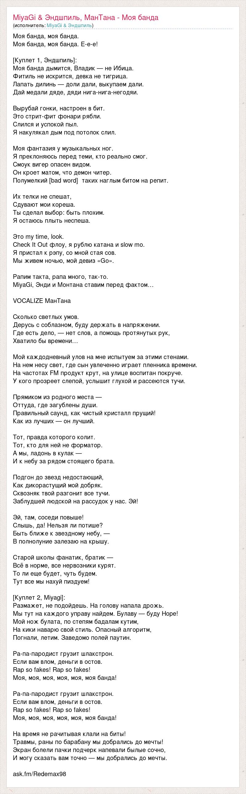 Моя банда, моя банда. Моя банда, моя банда. Е-е-е! [Куплет 1, Эндшпиль]: Моя банда дымится, Владик — не Ибица. Фитиль не искрится, девка не тигрица. Лапать дилинь — доли дали, выкупаем дали. Дай медали дяде, дяди нига-нига-негодяи. Вырубай гонки, настроен в бит. Это стрит-фит фонари рябли. Слился и успокой пыл. Я накулякал дым под потолок слил. Моя фантазия у музыкальных ног. Я преклоняюсь перед теми, кто реально смог. Смоук вигер опасен видом. Он кроет матом, что демон читер. Полумелкий [bad word] таких наглым битом на репит. Их телки не спешат, Сдувают мои кореша. Ты сделал выбор: быть плохим. Я остаюсь плыть неспеша. Это my time, look. Check It Out флоу, я рублю катана и slow mo. Я пристал к рэпу, со мной стая сов. Мы живем ночью, мой девиз «Go». Рапим такта, рапа много, так-то. MiyaGi, Энди и Монтана ставим перед фактом… VOCALIZE МанТана Сколько светлых умов. Дерусь с соблазном, буду держать в напряжении. Где есть дело, — нет слов, а помощь протянутых рук, Хватило бы времени… Мой каждодневный улов на мне испытуем за этими стенами. На нем несу свет, где сын увлеченно играет пленника времени. На частотах FM продукт крут, на улице воспитан покруче. У кого прозреет слепой, услышит глухой и рассеются тучи. Прямиком из родного места — Оттуда, где загублены души. Правильный саунд, как чистый кристалл прущий! Как из лучших — он лучший. Тот, правда которого колит. Тот, кто для ней не форматор. А мы, ладонь в кулак — И к небу за рядом стоящего брата. Подгон до звезд недостающий, Как дикорастущий мой добряк. Сквозняк твой разгонит все тучи. Заблудшей людской на рассудок у нас. Эй! Эй, там, соседи повыше! Слышь, да! Нельзя ли потише? Быть ближе к звездному небу, — В полнолуние залезаю на крышу. Старой школы фанатик, братик — Всё в норме, все нервозники курят. То ли еще будет, чуть будем. Тут все мы нахуй пиздуем! [Куплет 2, Miyagi]: Размажет, не подойдешь. На голову напала дрожь. Мы тут на каждого управу найдем. Булаву — буду Hope! Мой нож булата, по степям бадалам кутим, На кики наварю свой стиль. Опасный алгоритм, Погнали, летим. Заведомо полей паутин. Ра-па-пародист грузит шлакстрон. Если вам влом, деньги в остов. Rap so fakes! Rap so fakes! Моя, моя, моя, моя, моя, моя банда! Ра-па-пародист грузит шлакстрон. Если вам влом, деньги в остов. Rap so fakes! Rap so fakes! Моя, моя, моя, моя, моя, моя банда! На время не рачитывая клали на биты! Травмы, раны по барабану мы добрались до мечты! Экран болели пачки подчерк напевали былые сочно, И могу сказать вам точно — мы добрались до мечты. ask.fm/Redemax98