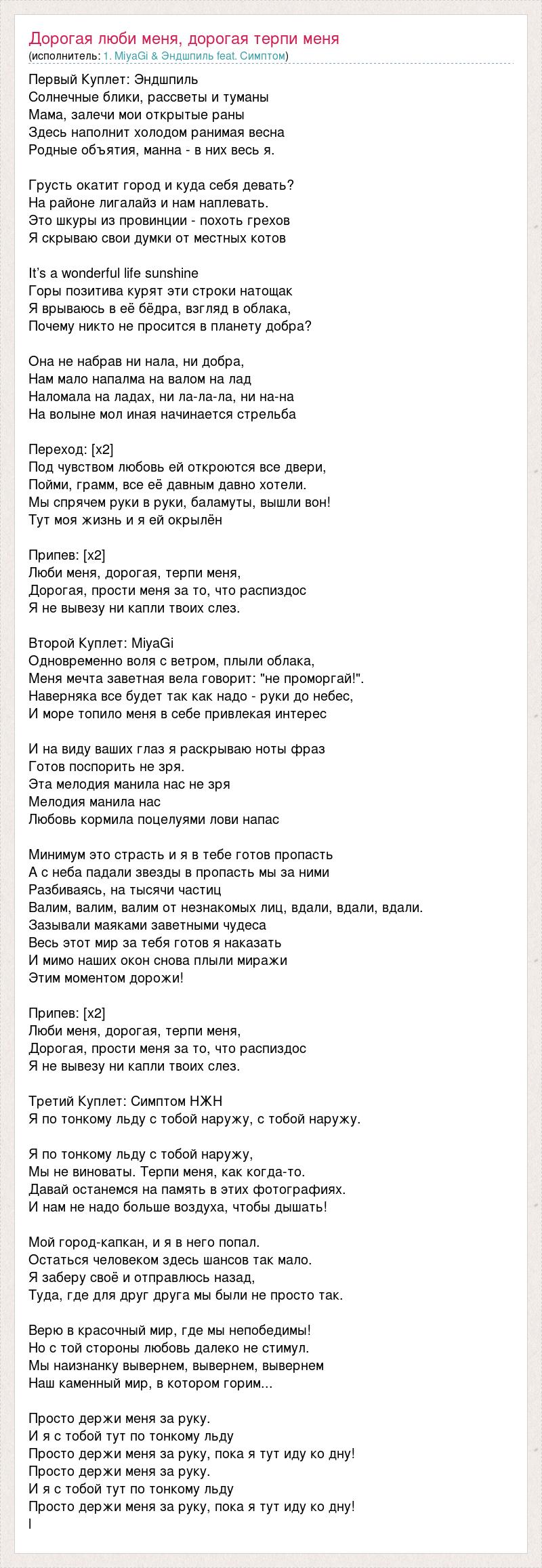 Первый Куплет: Эндшпиль Солнечные блики, рассветы и туманы Мама, залечи мои открытые раны Здесь наполнит холодом ранимая весна Родные объятия, манна - в них весь я. Грусть окатит город и куда себя девать? На районе лигалайз и нам наплевать. Это шкуры из провинции - похоть грехов Я скрываю свои думки от местных котов It’s a wonderful life sunshine Горы позитива курят эти строки натощак Я врываюсь в её бёдра, взгляд в облака, Почему никто не просится в планету добра? Она не набрав ни нала, ни добра, Нам мало напалма на валом на лад Наломала на ладах, ни ла-ла-ла, ни на-на На волыне мол иная начинается стрельба Переход: [х2] Под чувством любовь ей откроются все двери, Пойми, грамм, все её давным давно хотели. Мы спрячем руки в руки, баламуты, вышли вон! Тут моя жизнь и я ей окрылён Припев: [х2] Люби меня, дорогая, терпи меня, Дорогая, прости меня за то, что распиздос Я не вывезу ни капли твоих слез. Второй Куплет: MiyaGi Одновременно воля с ветром, плыли облака, Меня мечта заветная вела говорит: "не проморгай!". Наверняка все будет так как надо - руки до небес, И море топило меня в себе привлекая интерес И на виду ваших глаз я раскрываю ноты фраз Готов поспорить не зря. Эта мелодия манила нас не зря Мелодия манила нас Любовь кормила поцелуями лови напас Минимум это страсть и я в тебе готов пропасть А с неба падали звезды в пропасть мы за ними Разбиваясь, на тысячи частиц Валим, валим, валим от незнакомых лиц, вдали, вдали, вдали. Зазывали маяками заветными чудеса Весь этот мир за тебя готов я наказать И мимо наших окон снова плыли миражи Этим моментом дорожи! Припев: [х2] Люби меня, дорогая, терпи меня, Дорогая, прости меня за то, что распиздос Я не вывезу ни капли твоих слез. Третий Куплет: Симптом НЖН Я по тонкому льду с тобой наружу, с тобой наружу. Я по тонкому льду с тобой наружу, Мы не виноваты. Терпи меня, как когда-то. Давай останемся на память в этих фотографиях. И нам не надо больше воздуха, чтобы дышать! Мой город-капкан, и я в него попал. Остаться человеком здесь шансов так мало. Я заберу своё и отправлюсь назад, Туда, где для друг друга мы были не просто так. Верю в красочный мир, где мы непобедимы! Но с той стороны любовь далеко не стимул. Мы наизнанку вывернем, вывернем, вывернем Наш каменный мир, в котором горим... Просто держи меня за руку. И я с тобой тут по тонкому льду Просто держи меня за руку, пока я тут иду ко дну! Просто держи меня за руку. И я с тобой тут по тонкому льду Просто держи меня за руку, пока я тут иду ко дну! l