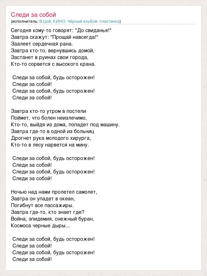 Сегодня кому-то говорят: "До свиданья!" Завтра скажут: "Прощай навсегда!" Заалеет сердечная рана. Завтра кто-то, вернувшись домой, Застанет в руинах свои города, Кто-то сорвется с высокого крана. Следи за собой, будь осторожен! Следи за собой! Следи за собой, будь осторожен! Следи за собой! Завтра кто-то утром в постели Поймет, что болен неизлечимо, Кто-то, выйдя из дома, попадет под машину. Завтра где-то в одной из больниц Дрогнет рука молодого хирурга, Кто-то в лесу нарвется на мину. Следи за собой, будь осторожен! Следи за собой! Следи за собой, будь осторожен! Следи за собой! Ночью над нами пролетел самолет, Завтра он упадет в океан, Погибнут все пассажиры. Завтра где-то, кто знает где? Война, эпидемия, снежный буран, Космоса черные дыры... Следи за собой, будь осторожен! Следи за собой! Следи за собой, будь осторожен! Следи за собой!