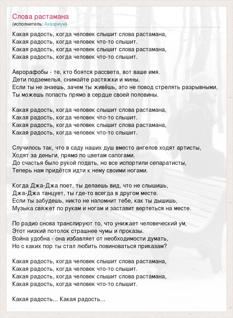Какая радость, когда человек слышит слова растамана, Какая радость, когда человек что-то слышит. Какая радость, когда человек слышит слова растамана, Какая радость, когда человек что-то слышит. Аврорафобы - те, кто боятся рассвета, вот ваше имя. Дети подземелья, снимайте растяжки и мины. Если ты не знаешь, зачем ты живёшь, это не повод стрелять разрывными, Ты можешь попасть прямо в сердце своей половины. Какая радость, когда человек слышит слова растамана, Какая радость, когда человек что-то слышит. Какая радость, когда человек слышит слова растамана, Какая радость, когда человек что-то слышит. Случилось так, что в саду наших душ вместо ангелов ходят артисты, Ходят за деньги, прямо по цветам сапогами. До счастья было рукой подать, но все испортили сепаратисты, Теперь нам придётся идти к нему своими ногами. Когда Джа-Джа поет, ты делаешь вид, что не слышишь, Джа-Джа танцует, ты где-то всегда в другом месте. Если ты забудешь, никто не напомнит тебе, как ты дышишь, Музыка свяжет по рукам и ногам и заставит вертеться на месте. По радио снова транслируют то, что унижает человеческий ум, Этот низкий потолок страшнее чумы и проказы. Война удобна - она избавляет от необходимости думать, Но с каких пор ты стал любить повиноваться приказам? Какая радость, когда человек слышит слова растамана, Какая радость, когда человек что-то слышит. Какая радость, когда человек слышит слова растамана, Какая радость, когда человек что-то слышит. Какая радость... Какая радость...