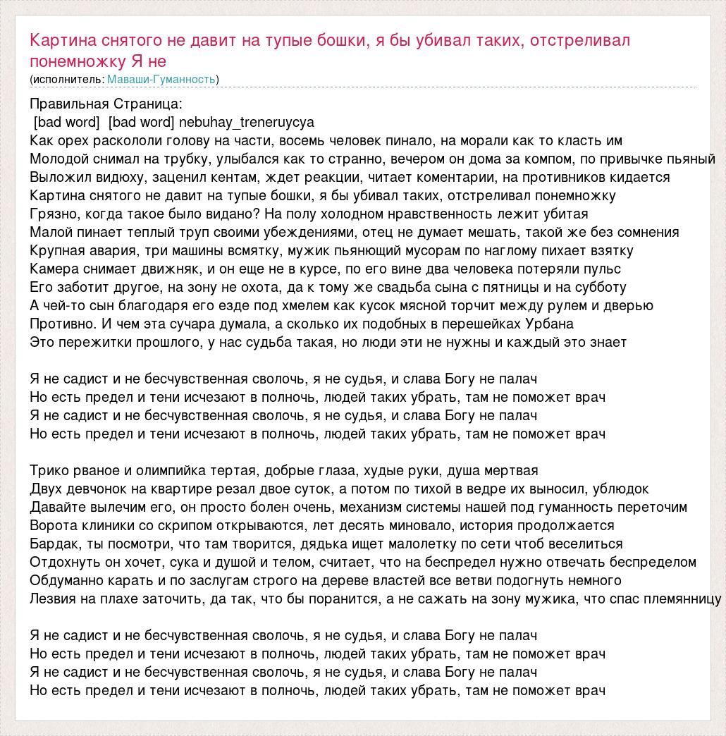 Правильная Страница: [bad word] [bad word] nebuhay_treneruycya Как орех раскололи голову на части, восемь человек пинало, на морали как то класть им Молодой снимал на трубку, улыбался как то странно, вечером он дома за компом, по привычке пьяный Выложил видюху, заценил кентам, ждет реакции, читает коментарии, на противников кидается Картина снятого не давит на тупые бошки, я бы убивал таких, отстреливал понемножку Грязно, когда такое было видано? На полу холодном нравственность лежит убитая Малой пинает теплый труп своими убеждениями, отец не думает мешать, такой же без сомнения Крупная авария, три машины всмятку, мужик пьянющий мусорам по наглому пихает взятку Камера снимает движняк, и он еще не в курсе, по его вине два человека потеряли пульс Его заботит другое, на зону не охота, да к тому же свадьба сына с пятницы и на субботу А чей-то сын благодаря его езде под хмелем как кусок мясной торчит между рулем и дверью Противно. И чем эта сучара думала, а сколько их подобных в перешейках Урбана Это пережитки прошлого, у нас судьба такая, но люди эти не нужны и каждый это знает Я не садист и не бесчувственная сволочь, я не судья, и слава Богу не палач Но есть предел и тени исчезают в полночь, людей таких убрать, там не поможет врач Я не садист и не бесчувственная сволочь, я не судья, и слава Богу не палач Но есть предел и тени исчезают в полночь, людей таких убрать, там не поможет врач Трико рваное и олимпийка тертая, добрые глаза, худые руки, душа мертвая Двух девчонок на квартире резал двое суток, а потом по тихой в ведре их выносил, ублюдок Давайте вылечим его, он просто болен очень, механизм системы нашей под гуманность переточим Ворота клиники со скрипом открываются, лет десять миновало, история продолжается Бардак, ты посмотри, что там творится, дядька ищет малолетку по сети чтоб веселиться Отдохнуть он хочет, сука и душой и телом, считает, что на беспредел нужно отвечать беспределом Обдуманно карать и по заслугам строго на дереве властей все ветви подогнуть немного Лезвия на плахе заточить, да так, что бы поранится, а не сажать на зону мужика, что спас племянницу Я не садист и не бесчувственная сволочь, я не судья, и слава Богу не палач Но есть предел и тени исчезают в полночь, людей таких убрать, там не поможет врач Я не садист и не бесчувственная сволочь, я не судья, и слава Богу не палач Но есть предел и тени исчезают в полночь, людей таких убрать, там не поможет врач