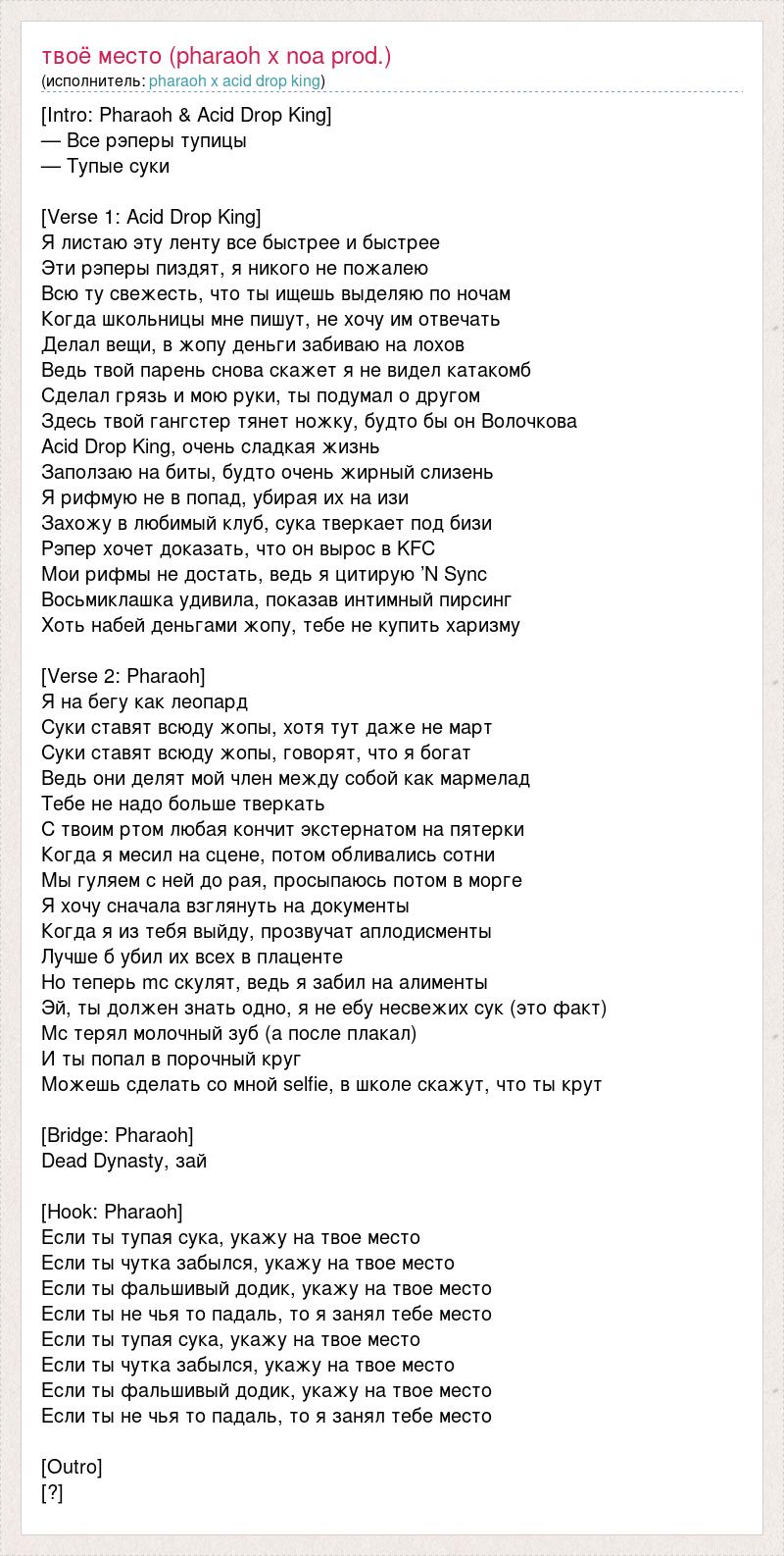 [Intro: Pharaoh & Acid Drop King] — Все рэперы тупицы — Тупые суки [Verse 1: Acid Drop King] Я листаю эту ленту все быстрее и быстрее Эти рэперы пиздят, я никого не пожалею Всю ту свежесть, что ты ищешь выделяю по ночам Когда школьницы мне пишут, не хочу им отвечать Делал вещи, в жопу деньги забиваю на лохов Ведь твой парень снова скажет я не видел катакомб Сделал грязь и мою руки, ты подумал о другом Здесь твой гангстер тянет ножку, будто бы он Волочкова Acid Drop King, очень сладкая жизнь Заползаю на биты, будто очень жирный слизень Я рифмую не в попад, убирая их на изи Захожу в любимый клуб, сука тверкает под бизи Рэпер хочет доказать, что он вырос в KFC Мои рифмы не достать, ведь я цитирую ’N Sync Восьмиклашка удивила, показав интимный пирсинг Хоть набей деньгами жопу, тебе не купить харизму [Verse 2: Pharaoh] Я на бегу как леопард Суки ставят всюду жопы, хотя тут даже не март Суки ставят всюду жопы, говорят, что я богат Ведь они делят мой член между собой как мармелад Тебе не надо больше тверкать С твоим ртом любая кончит экстернатом на пятерки Когда я месил на сцене, потом обливались сотни Мы гуляем с ней до рая, просыпаюсь потом в морге Я хочу сначала взглянуть на документы Когда я из тебя выйду, прозвучат аплодисменты Лучше б убил их всех в плаценте Но теперь mc скулят, ведь я забил на алименты Эй, ты должен знать одно, я не ебу несвежих сук (это факт) Mc терял молочный зуб (а после плакал) И ты попал в порочный круг Можешь сделать со мной selfie, в школе скажут, что ты крут [Bridge: Pharaoh] Dead Dynasty, зай [Hook: Pharaoh] Если ты тупая сука, укажу на твое место Если ты чутка забылся, укажу на твое место Если ты фальшивый додик, укажу на твое место Если ты не чья то падаль, то я занял тебе место Если ты тупая сука, укажу на твое место Если ты чутка забылся, укажу на твое место Если ты фальшивый додик, укажу на твое место Если ты не чья то падаль, то я занял тебе место [Outro] [?]