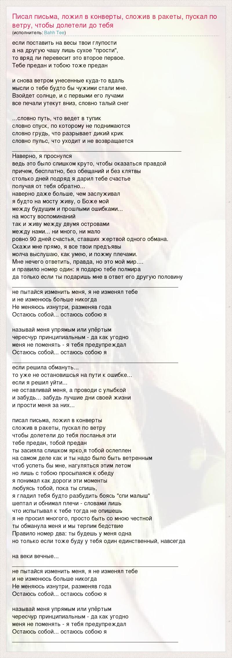 если поставить на весы твои глупости а на другую чашу лишь сухое "прости", то вряд ли перевесит это второе первое. Тебе предан и тобою тоже предан и снова ветром унесенные куда-то вдаль мысли о тебе будто бы чужими стали мне. Взойдет солнце, и с первыми его лучами все печали утекут вниз, словно талый снег ...словно путь, что ведет в тупик словно спуск, по которому не поднимаются словно грудь, что разрывает дикий крик словно пульс, что уходит и не возвращается _____________________________________________________ Наверно, я проснулся ведь это было слишком круто, чтобы оказаться правдой причем, бесплатно, без обещаний и без клятвы столько дней подряд я дарил тебе счастье получая от тебя обратно... наверно даже больше, чем заслуживал я будто на мосту живу, о Боже мой между будущим и прошлыми ошибками... на мосту воспоминаний так и живу между двумя островами между нами... ни много, ни мало ровно 90 дней счастья, ставших жертвой одного обмана. Скажи мне прямо, я все твои предъявы молча выслушаю, как умею, и пожму плечами. Мне нечего ответить, правда, но это мой мир.... и правило номер один: я подарю тебе полмира да только если ты подаришь мне в ответ его другую половину ____________________________________________________ не пытайся изменить меня, я не изменял тебе и не изменюсь больше никогда Не меняюсь изнутри, разменяв года Остаюсь собой... остаюсь собою я называй меня упрямым или упёртым чересчур принципиальным - да как угодно меня не поменять - я тебя предупреждал Остаюсь собой... остаюсь собою я ____________________________________________________ если решила обмануть... то уже не остановишсья на пути к ошибке... если я решил уйти... не оставливай меня, а проводи с улыбкой и забудь... забудь лучшие дни своей жизни и прости меня за них... писал письма, ложил в конверты сложив в ракеты, пускал по ветру чтобы долетели до тебя посланья эти тебе предан, тобой предан ты засияла слишком ярко,я тобой ослеплен на самом деле как и ты надо было быть ветренным чтоб успеть бы мне, нагуляться этим летом но лишь с тобою просыпаяся к обеду я понимал как дороги эти моменты любуясь тобой, пока ты спишь, я гладил тебя будто разбудить боясь "спи малыш" шептал и обнимал плечи - словами лишь что испытывал к тебе тогда не опишешь я не просил многого, просто быть со мною честной ты обманула меня и мы терпим бедствие Правило номер два: ты будешь у меня одна но только если тоже буду у тебя один единственный, навсегда на веки вечные... ____________________________________________________ не пытайся изменить меня, я не изменял тебе и не изменюсь больше никогда Не меняюсь изнутри, разменяв года Остаюсь собой... остаюсь собою я называй меня упрямым или упёртым чересчур принципиальным - да как угодно меня не поменять - я тебя предупреждал Остаюсь собой... остаюсь собою я ____________________________________________________