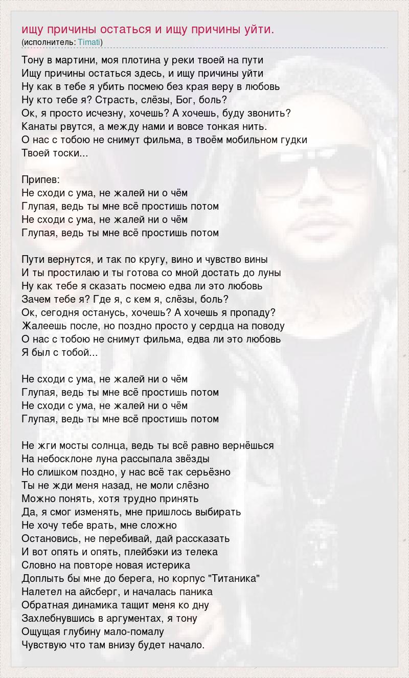 Тону в мартини, моя плотина у реки твоей на пути Ищу причины остаться здесь, и ищу причины уйти Ну как в тебе я убить посмею без края веру в любовь Ну кто тебе я? Страсть, слёзы, Бог, боль? Ок, я просто исчезну, хочешь? А хочешь, буду звонить? Канаты рвутся, а между нами и вовсе тонкая нить. О нас с тобою не снимут фильма, в твоём мобильном гудки Твоей тоски... Припев: Не сходи с ума, не жалей ни о чём Глупая, ведь ты мне всё простишь потом Не сходи с ума, не жалей ни о чём Глупая, ведь ты мне всё простишь потом Пути вернутся, и так по кругу, вино и чувство вины И ты простилаю и ты готова со мной достать до луны Ну как тебе я сказать посмею едва ли это любовь Зачем тебе я? Где я, с кем я, слёзы, боль? Ок, сегодня останусь, хочешь? А хочешь я пропаду? Жалеешь после, но поздно просто у сердца на поводу О нас с тобою не снимут фильма, едва ли это любовь Я был с тобой... Не сходи с ума, не жалей ни о чём Глупая, ведь ты мне всё простишь потом Не сходи с ума, не жалей ни о чём Глупая, ведь ты мне всё простишь потом Не жги мосты солнца, ведь ты всё равно вернёшься На небосклоне луна рассыпала звёзды Но слишком поздно, у нас всё так серьёзно Ты не жди меня назад, не моли слёзно Можно понять, хотя трудно принять Да, я смог изменять, мне пришлось выбирать Не хочу тебе врать, мне сложно Остановись, не перебивай, дай рассказать И вот опять и опять, плейбэки из телека Словно на повторе новая истерика Доплыть бы мне до берега, но корпус "Титаника" Налетел на айсберг, и началась паника Обратная динамика тащит меня ко дну Захлебнувшись в аргументах, я тону Ощущая глубину мало-помалу Чувствую что там внизу будет начало.