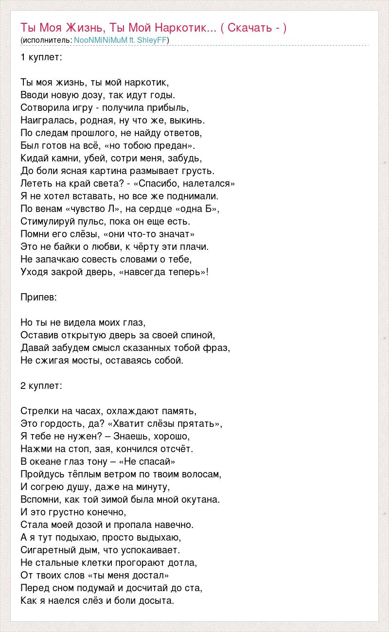 1 куплет: Ты моя жизнь, ты мой наркотик, Вводи новую дозу, так идут годы. Сотворила игру - получила прибыль, Наигралась, родная, ну что же, выкинь. По следам прошлого, не найду ответов, Был готов на всё, «но тобою предан». Кидай камни, убей, сотри меня, забудь, До боли ясная картина размывает грусть. Лететь на край света? - «Спасибо, налетался» Я не хотел вставать, но все же поднимали. По венам «чувство Л», на сердце «одна Б», Стимулируй пульс, пока он еще есть. Помни его слёзы, «они что-то значат» Это не байки о любви, к чёрту эти плачи. Не запачкаю совесть словами о тебе, Уходя закрой дверь, «навсегда теперь»! Припев: Но ты не видела моих глаз, Оставив открытую дверь за своей спиной, Давай забудем смысл сказанных тобой фраз, Не сжигая мосты, оставаясь собой. 2 куплет: Стрелки на часах, охлаждают память, Это гордость, да? «Хватит слёзы прятать», Я тебе не нужен? – Знаешь, хорошо, Нажми на стоп, зая, кончился отсчёт. В океане глаз тону – «Не спасай» Пройдусь тёплым ветром по твоим волосам, И согрею душу, даже на минуту, Вспомни, как той зимой была мной окутана. И это грустно конечно, Стала моей дозой и пропала навечно. А я тут подыхаю, просто выдыхаю, Сигаретный дым, что успокаивает. Не стальные клетки прогорают дотла, От твоих слов «ты меня достал» Перед сном подумай и досчитай до ста, Как я наелся слёз и боли досыта.