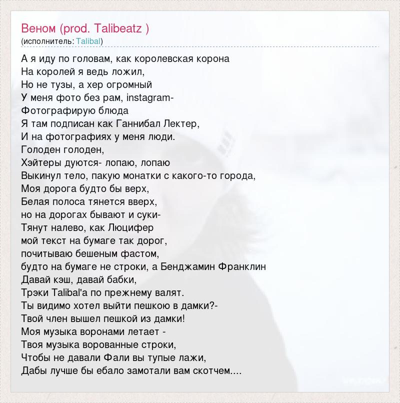 А я иду по головам, как королевская корона На королей я ведь ложил, Но не тузы, а хер огромный У меня фото без рам, instagram- Фотографирую блюда Я там подписан как Ганнибал Лектер, И на фотографиях у меня люди. Голоден голоден, Хэйтеры дуются- лопаю, лопаю Выкинул тело, пакую монатки с какого-то города, Моя дорога будто бы верх, Белая полоса тянется вверх, но на дорогах бывают и суки- Тянут налево, как Люцифер мой текст на бумаге так дорог, почитываю бешеным фастом, будто на бумаге не строки, а Бенджамин Франклин Давай кэш, давай бабки, Трэки Talibal'а по прежнему валят. Ты видимо хотел выйти пешкою в дамки?- Твой член вышел пешкой из дамки! Моя музыка воронами летает - Твоя музыка ворованные строки, Чтобы не давали Фали вы тупые лажи, Дабы лучше бы ебало замотали вам скотчем....